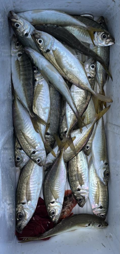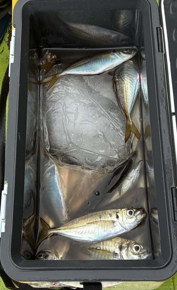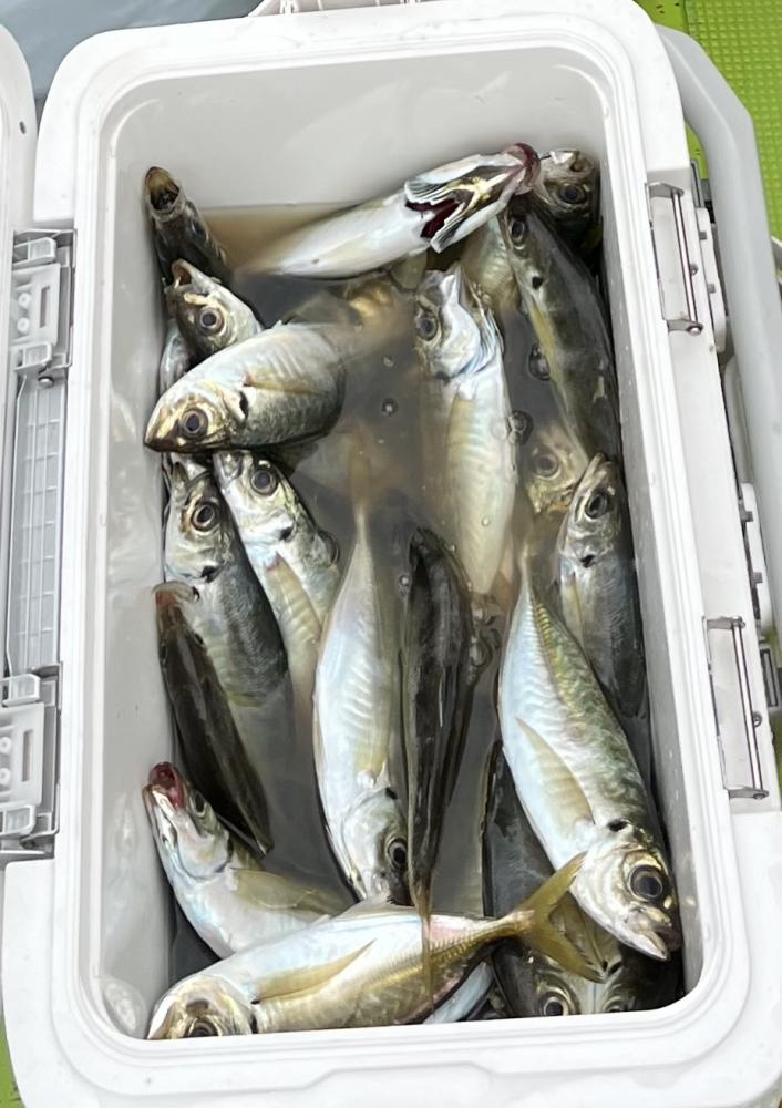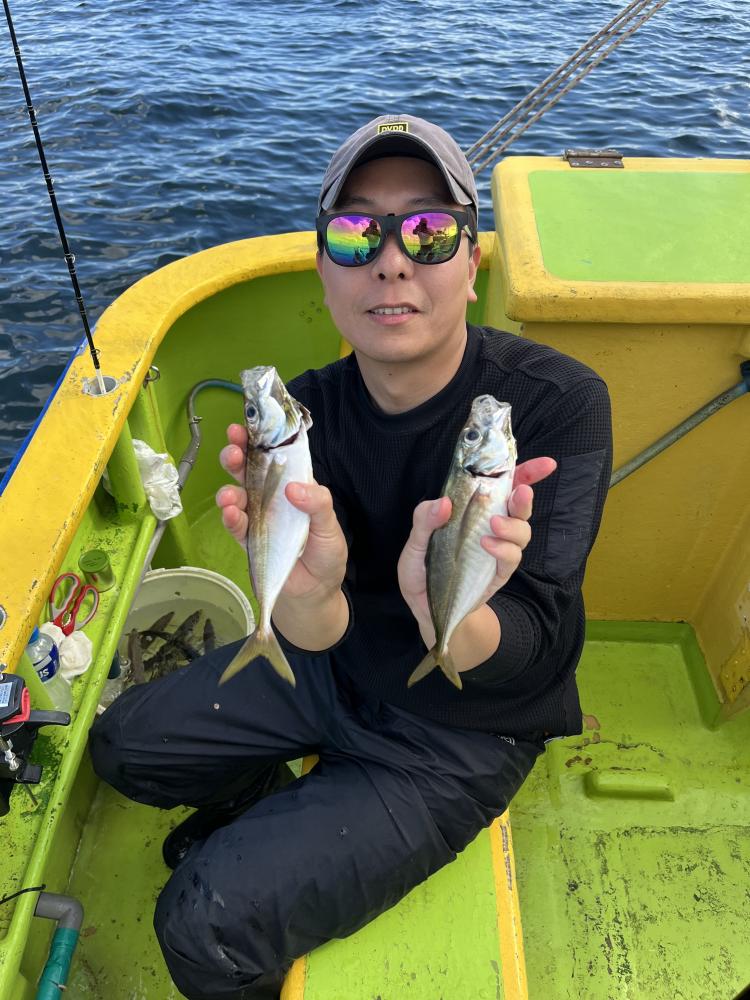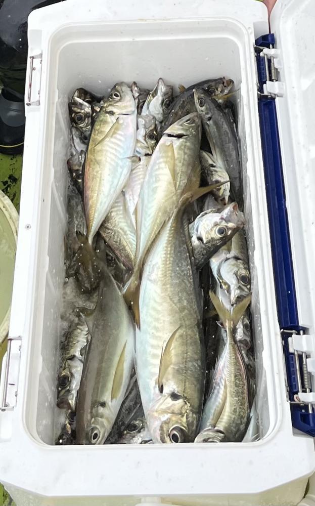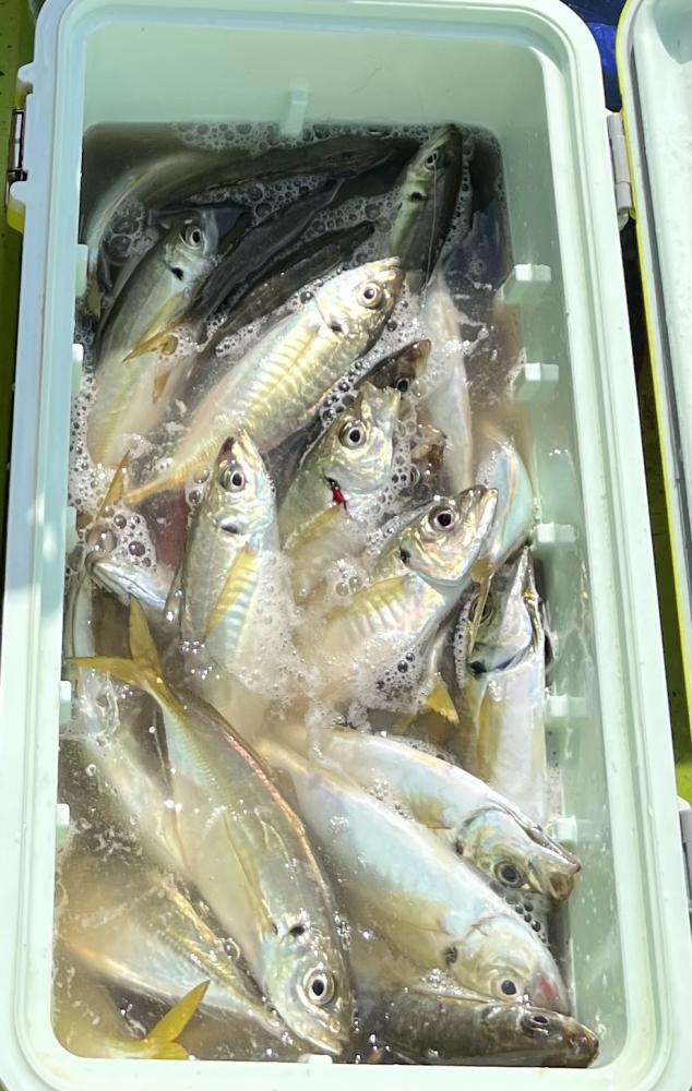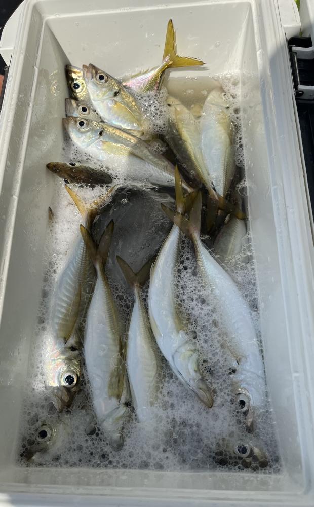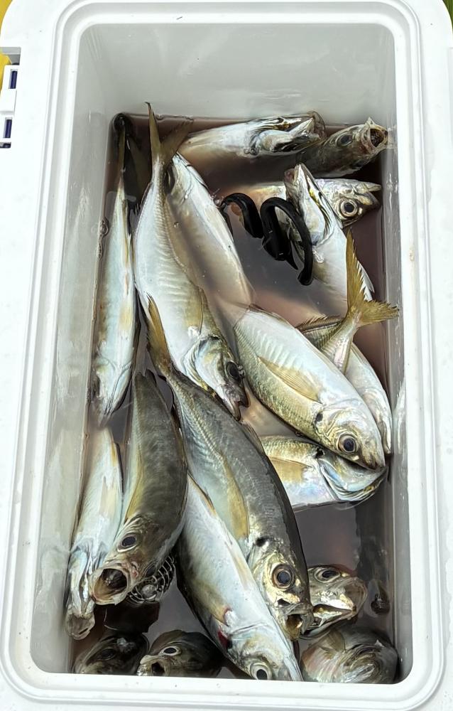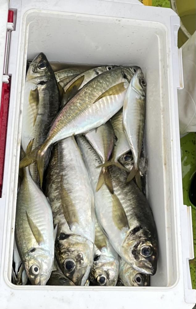10時45分にタチウオ狙いは終了して、ナギの海上で、レンタルテンヤロッド多数の片付けからレンタルアジロッド多数の支度、ロッドキーパーの取り付けから電源接続、猿島金アジポイントで釣り方レクチャーからの実釣までの取次ぎ時間は1時間20分のアジ釣り開始時間は11時05分となりました、沖上がり時間まで1時間55分とポイント探索時間も限られてある中、実釣開始、反応が入って来ると猿島金アジの顔見られるも❓中々連打❗️連打❗️とはならず、ポイント探索からの探索からの実釣開始するも❓ラスト30分で実釣開始すると活性の高い群れに遭遇して連打❗️連打❗️のシーンもあり、ビシアジデビュー戦の方々にもプチ盛り上がりを体験して頂けました⭕️