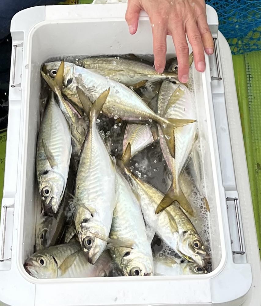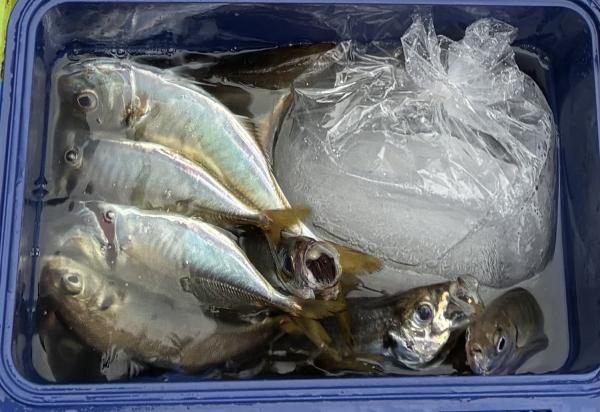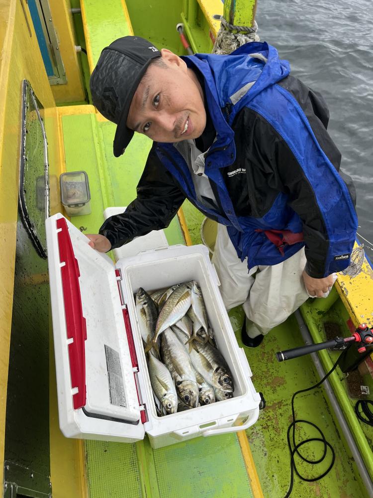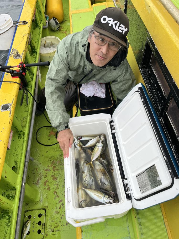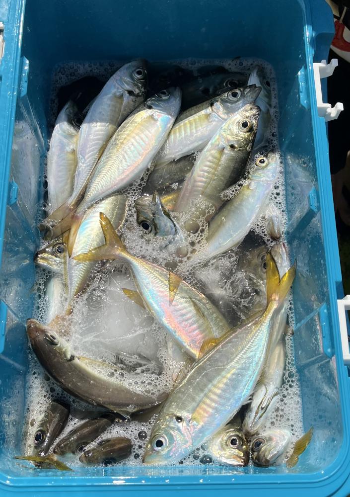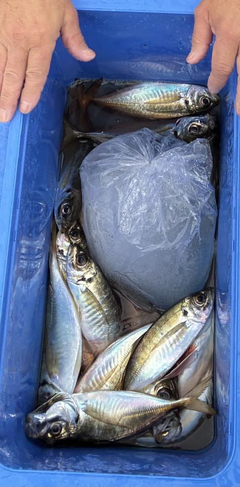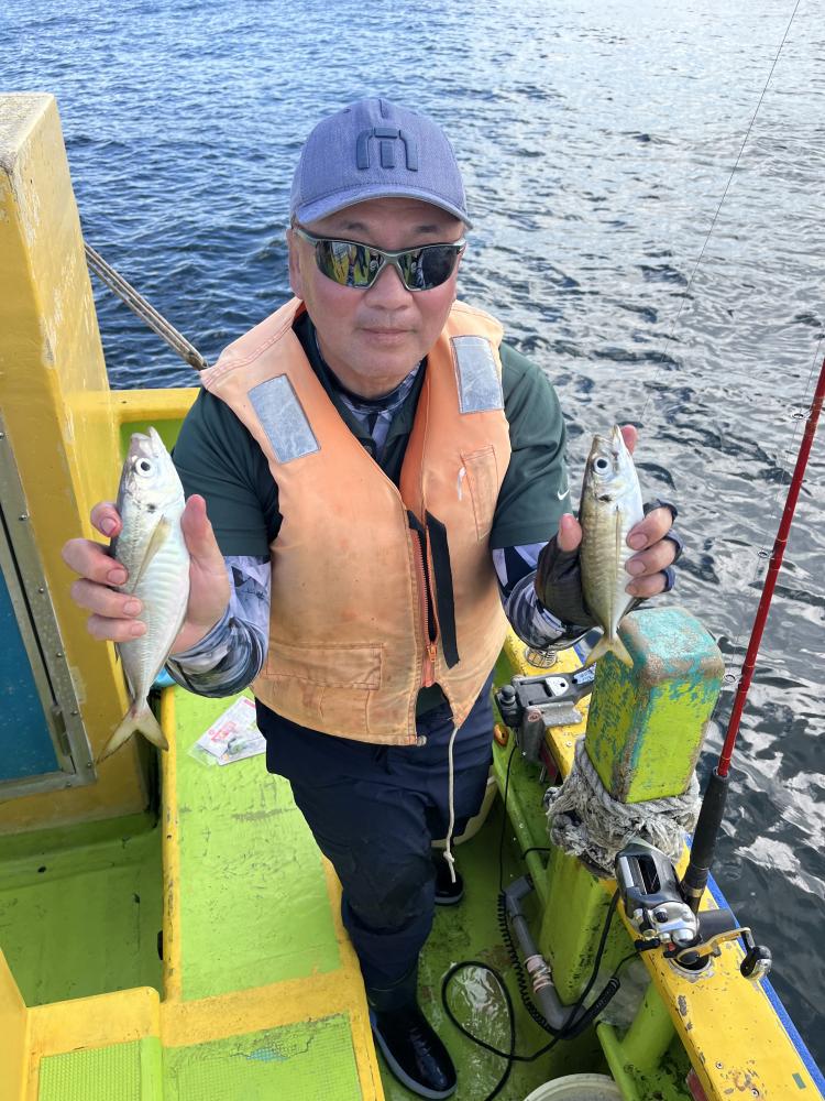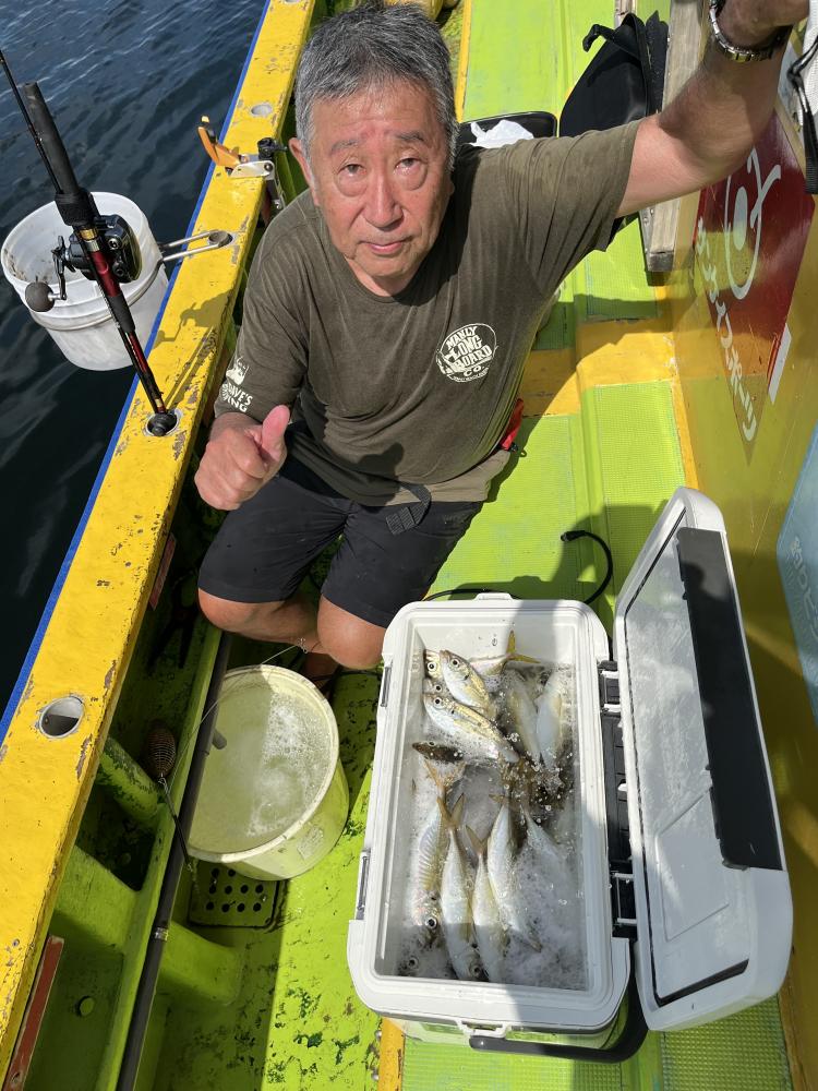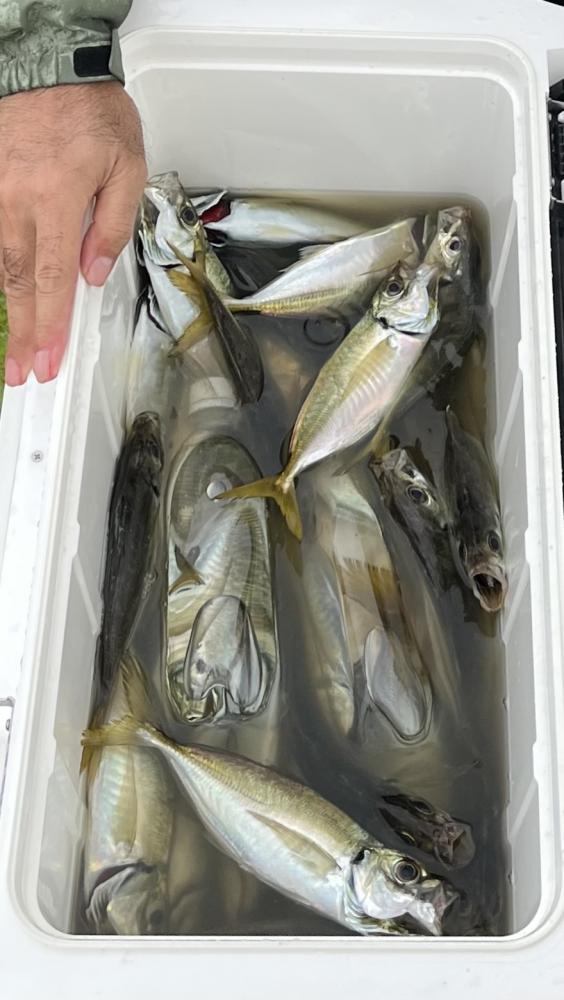 10時45分にタチウオ狙いは終了して、ナギの海上で、レンタルテンヤロッド多数の片付けからレンタルアジロッド多数の支度、ロッドキーパーの取り付けから電源接続、猿島金アジポイントで釣り方レクチャーからの実釣までの取次ぎ時間は1時間20分のアジ釣り開始時間は11時05分となりました、沖上がり時間まで1時間55分とポイント探索時間も限られてある中、実釣開始、反応が入って来ると猿島金アジの顔見られるも❓中々連打❗️連打❗️とはならず、ポイント探索からの探索からの実釣開始するも❓ラスト30分で実釣開始すると活性の高い群れに遭遇して連打❗️連打❗️のシーンもあり、ビシアジデビュー戦の方々にもプチ盛り上がりを体験して頂けました⭕️