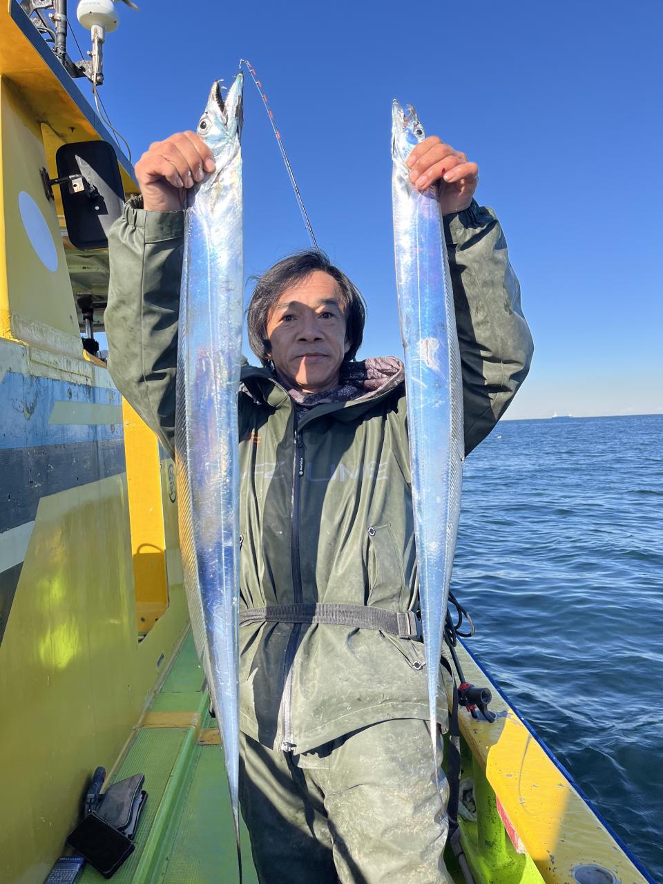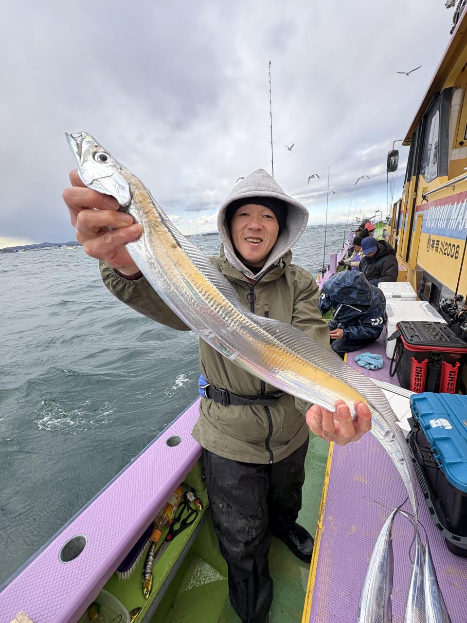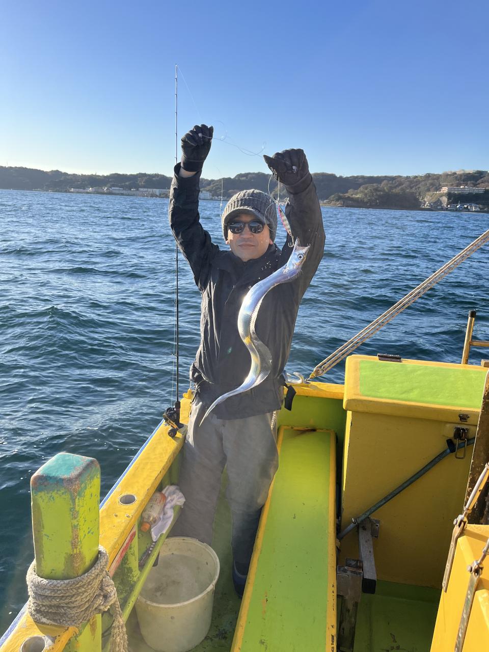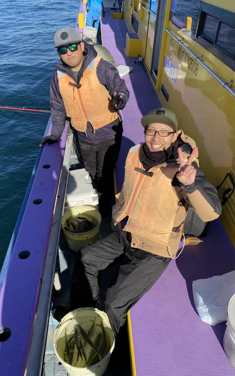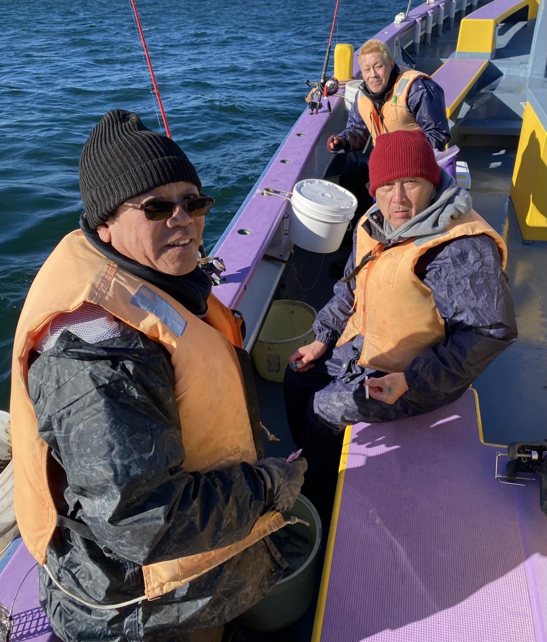 裕司船長、左舷側のお二人のお兄さん達、寒い中頑張ってレクチャー通りのロッドアクションでタチウオゲット✌️
