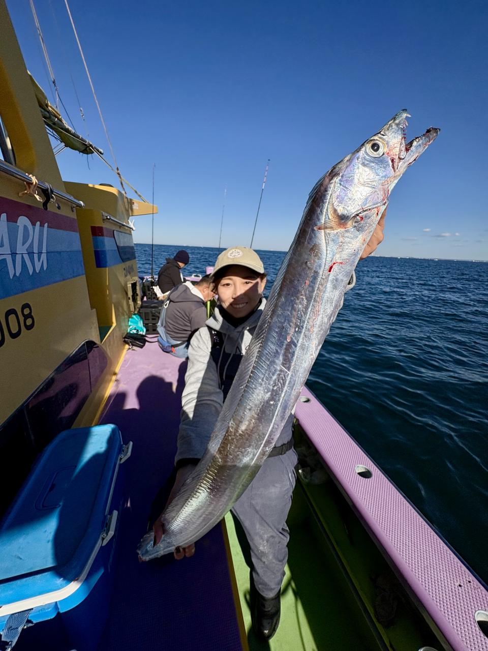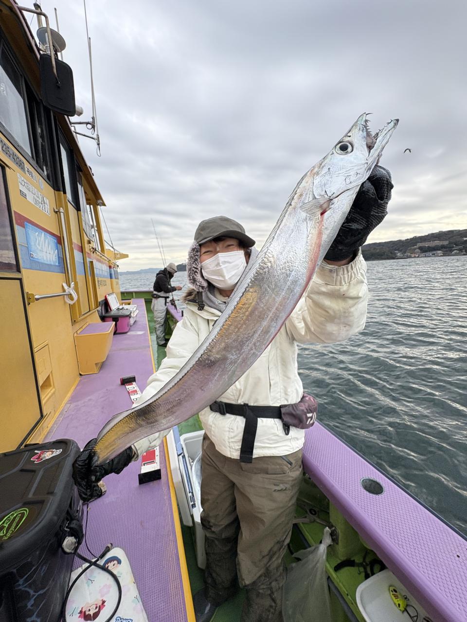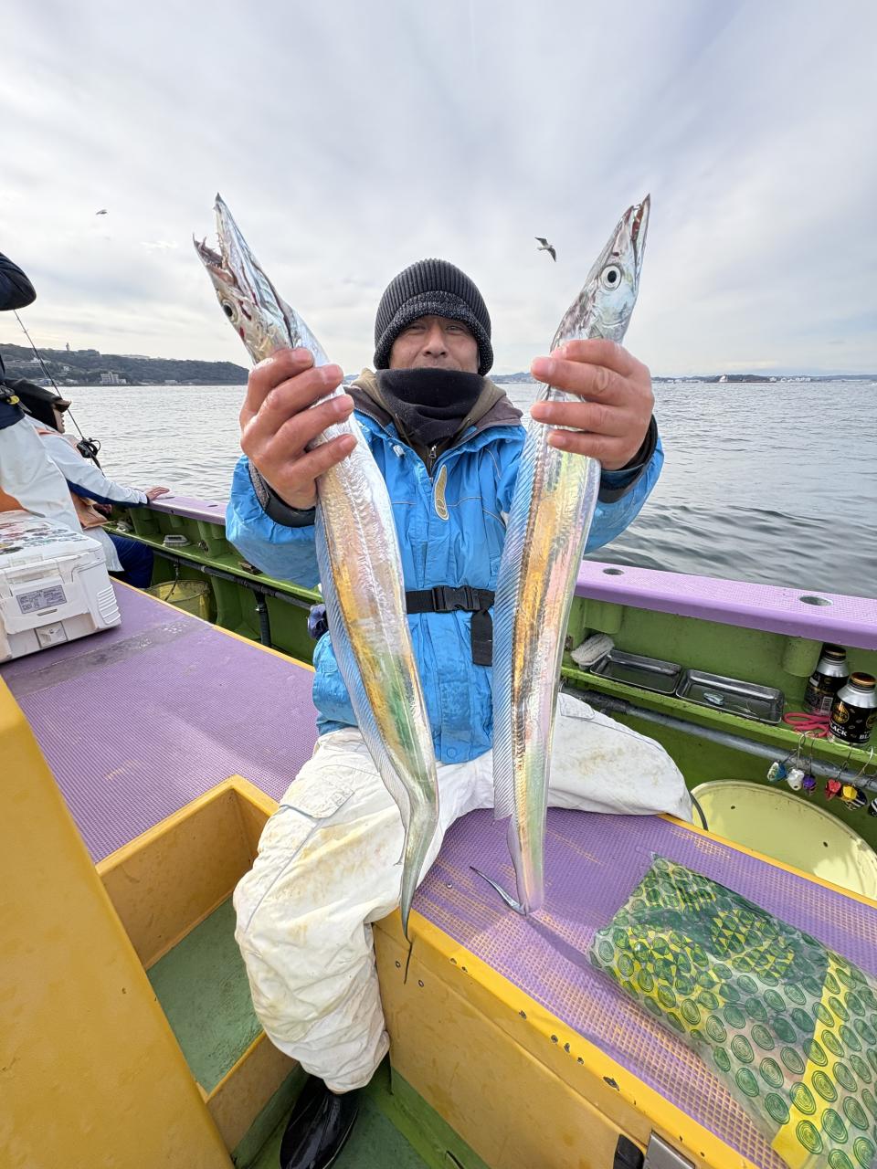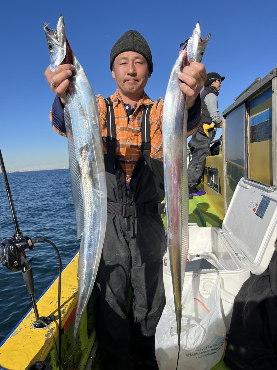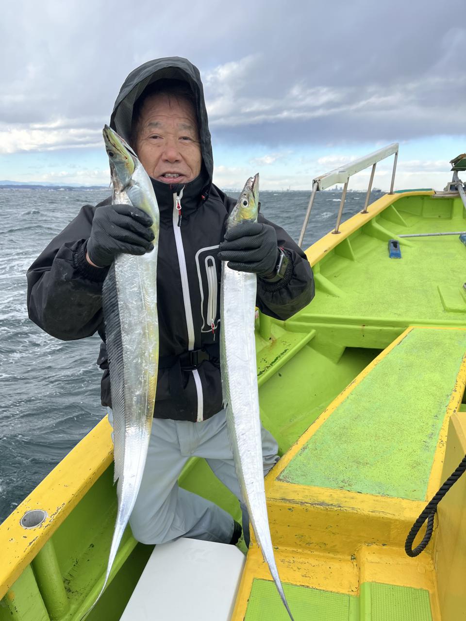 裕司船長、左舷側のお二人のお兄さん達、寒い中頑張ってレクチャー通りのロッドアクションでタチウオゲット✌️