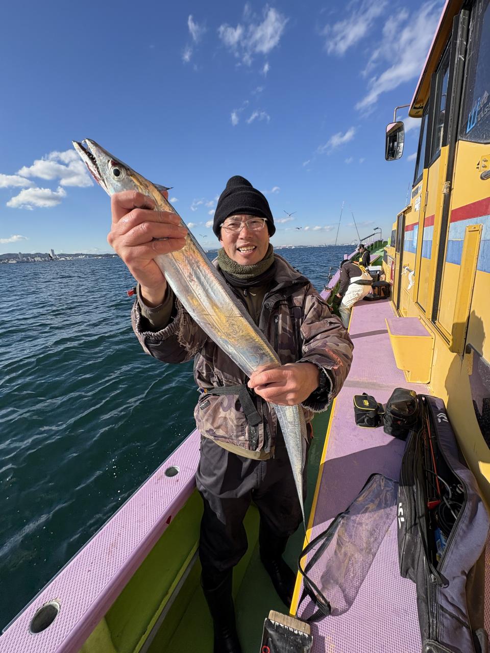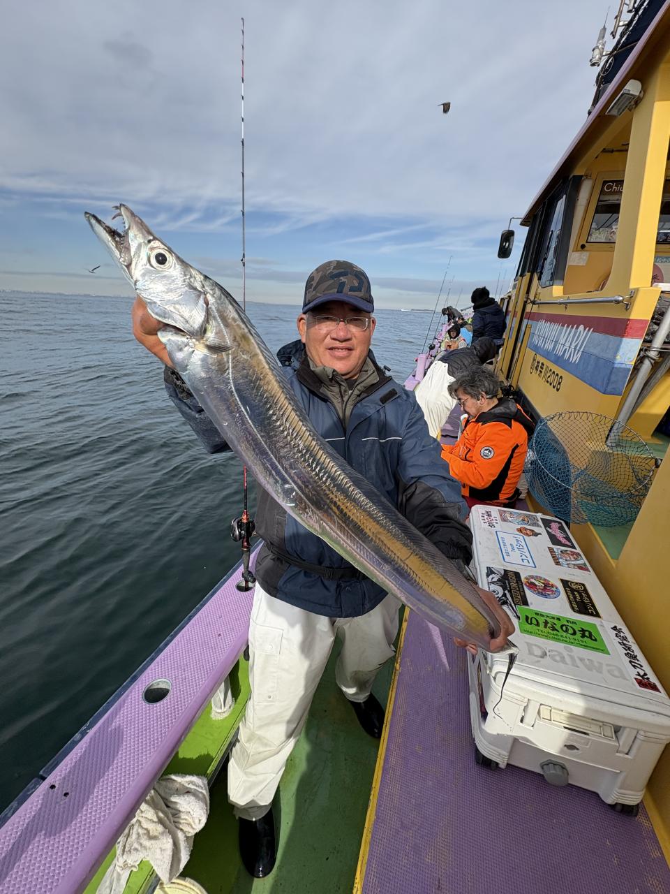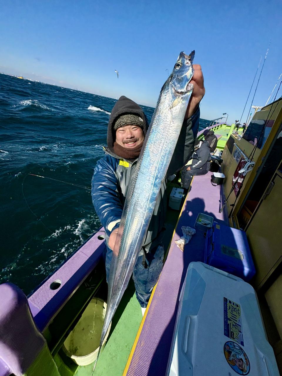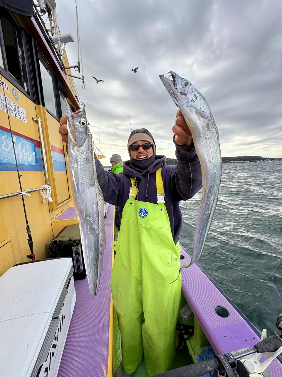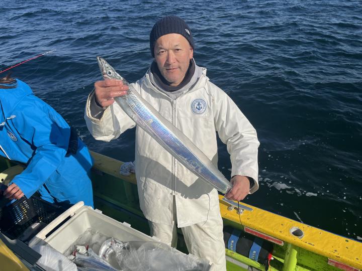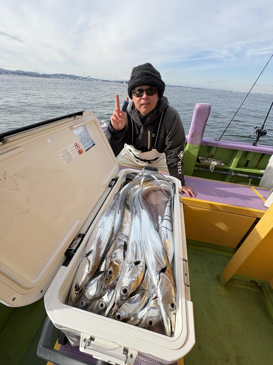 裕司船長、左舷側のお二人のお兄さん達、寒い中頑張ってレクチャー通りのロッドアクションでタチウオゲット✌️