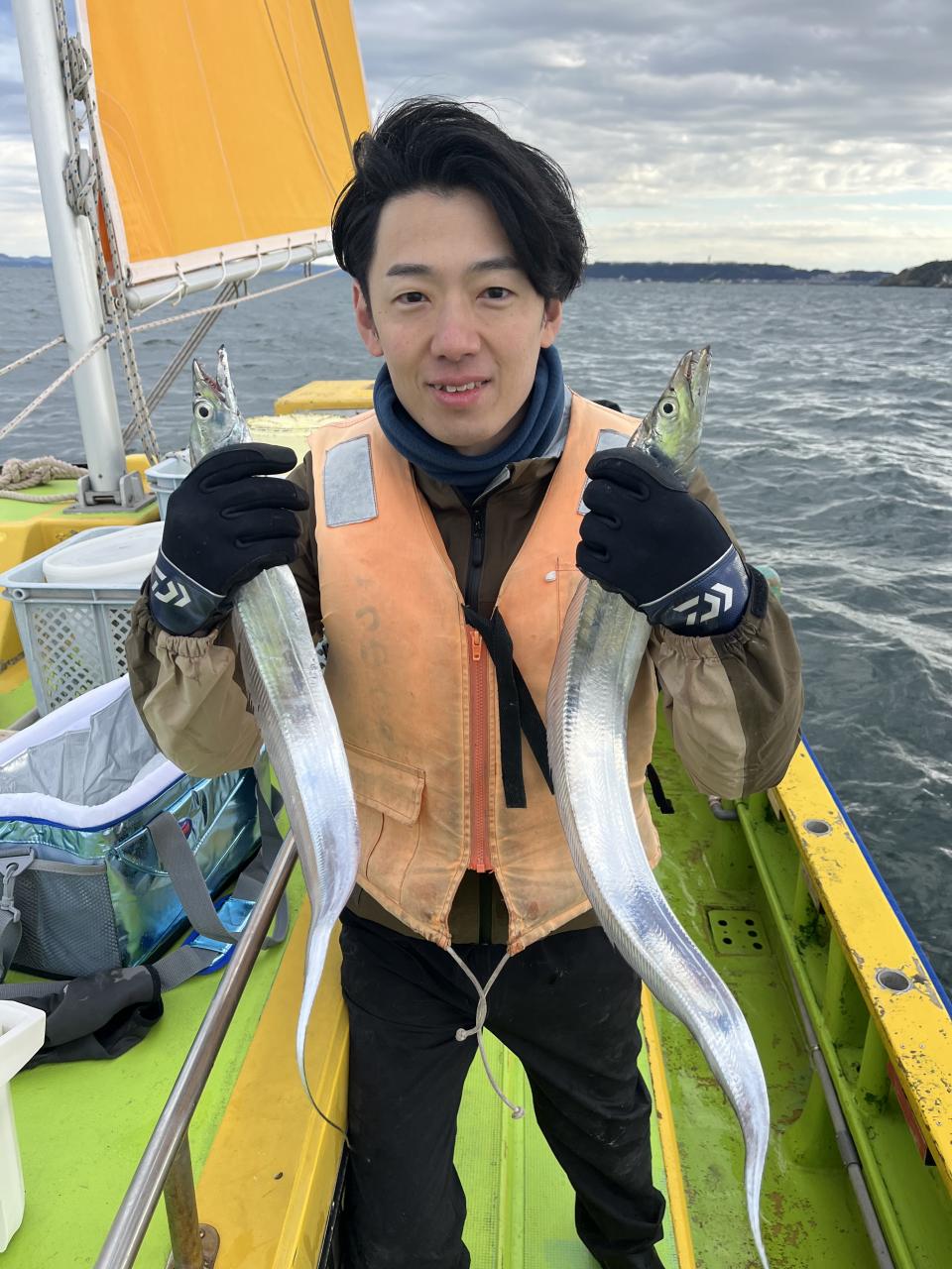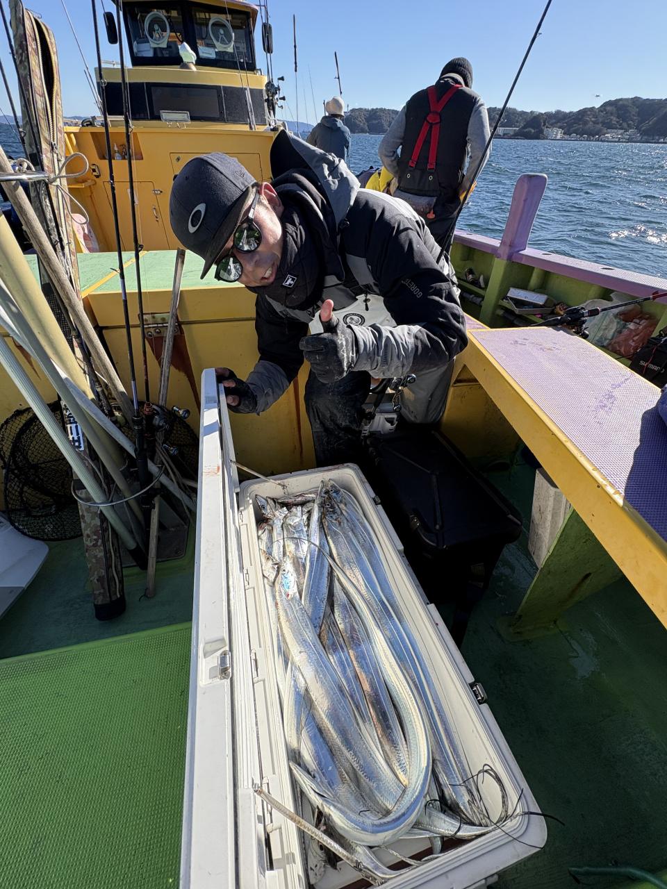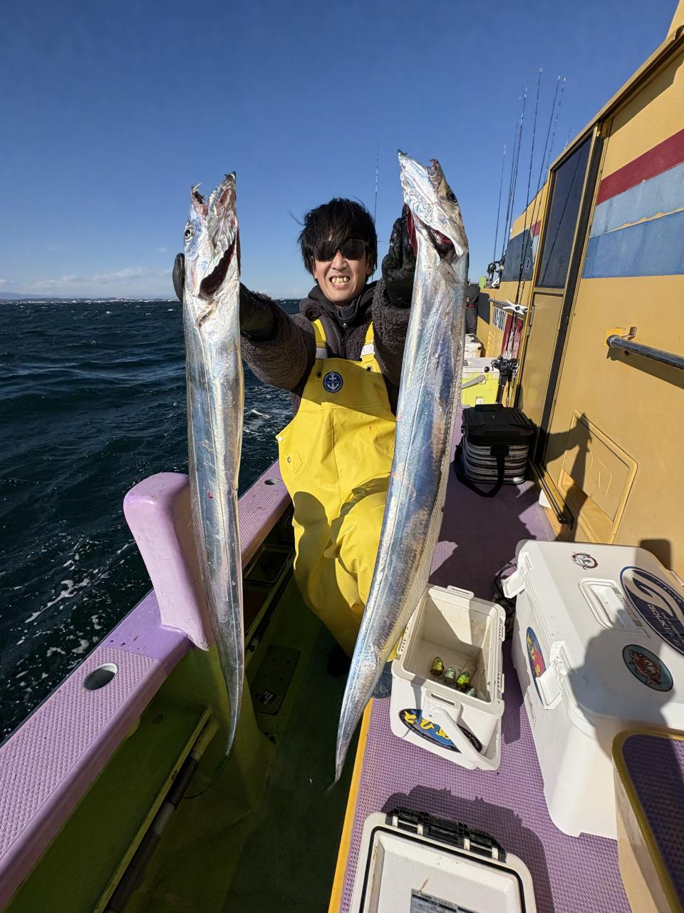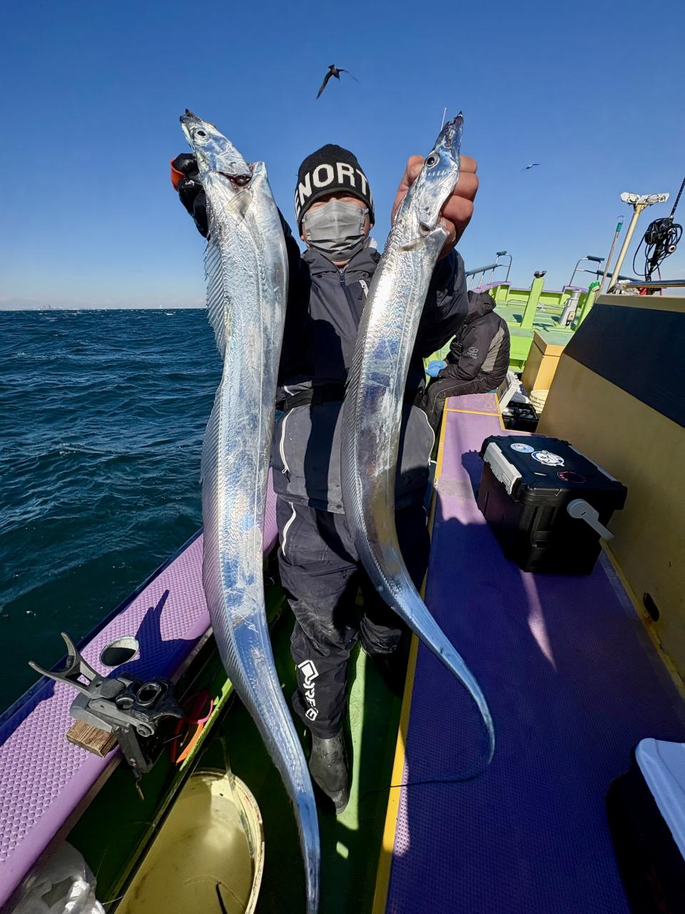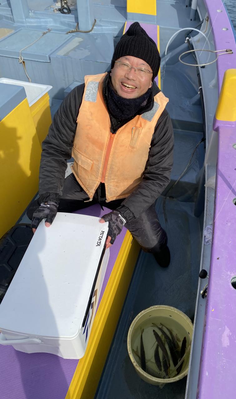 裕司船長、左舷側のお二人のお兄さん達、寒い中頑張ってレクチャー通りのロッドアクションでタチウオゲット✌️
