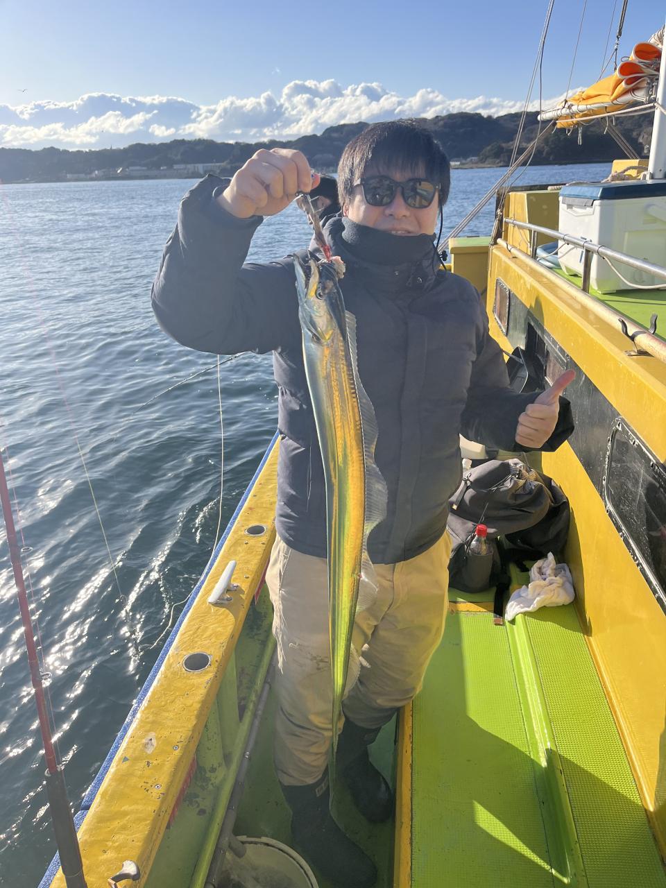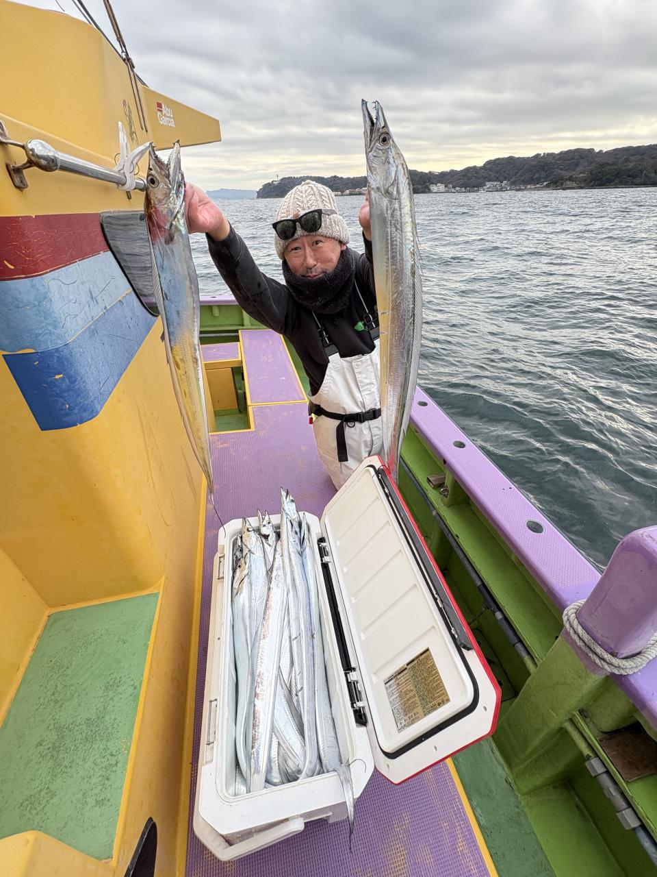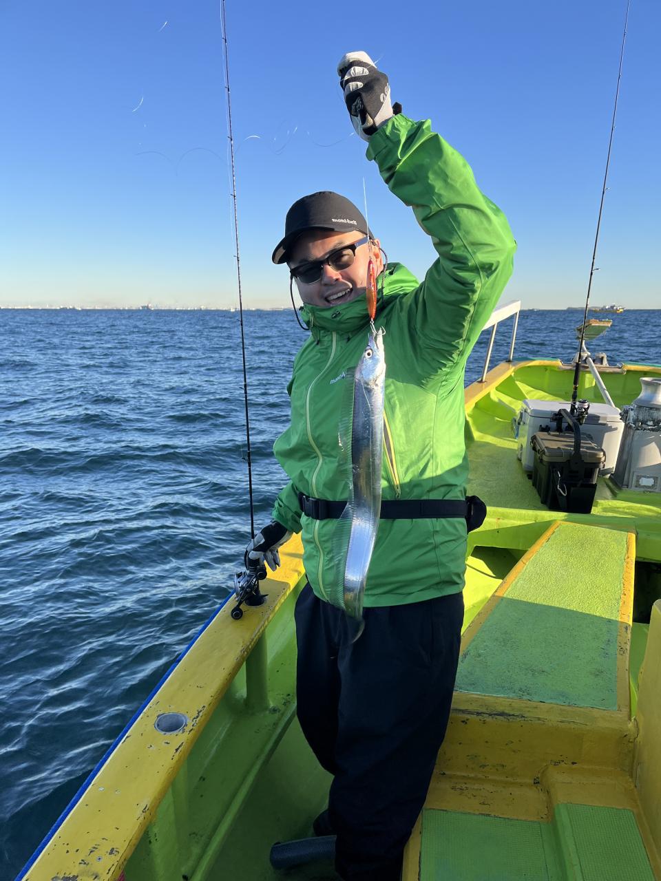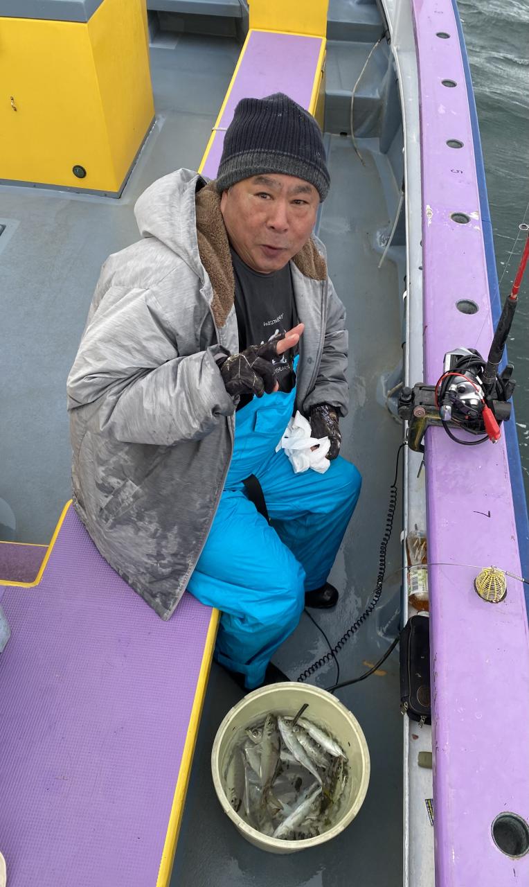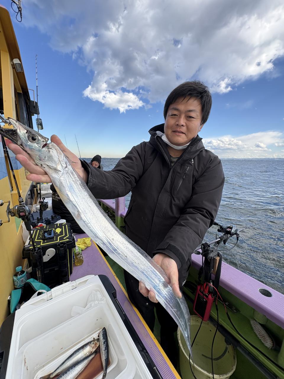 裕司船長、左舷側のお二人のお兄さん達、寒い中頑張ってレクチャー通りのロッドアクションでタチウオゲット✌️