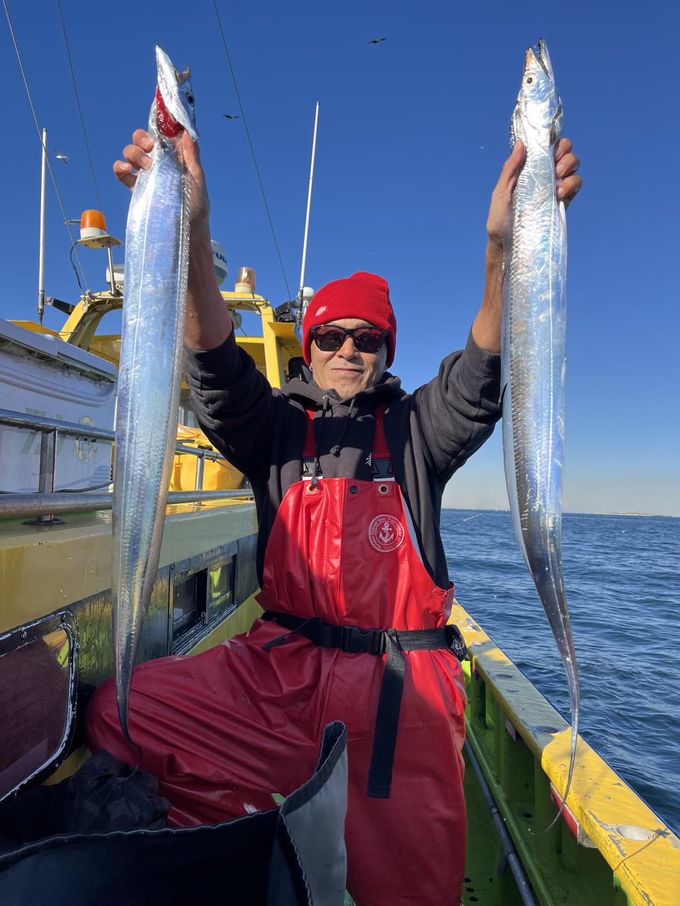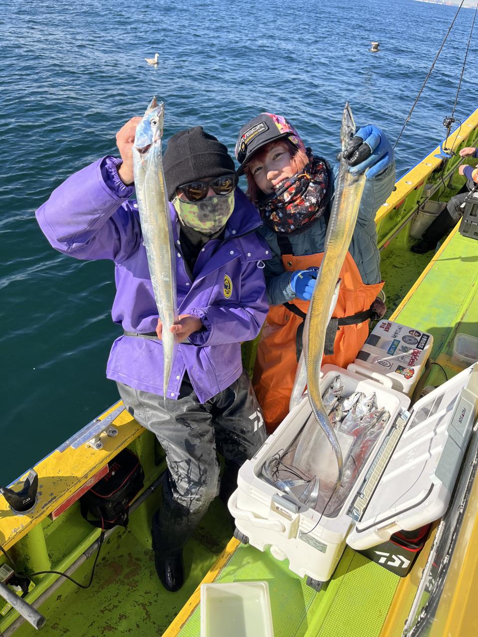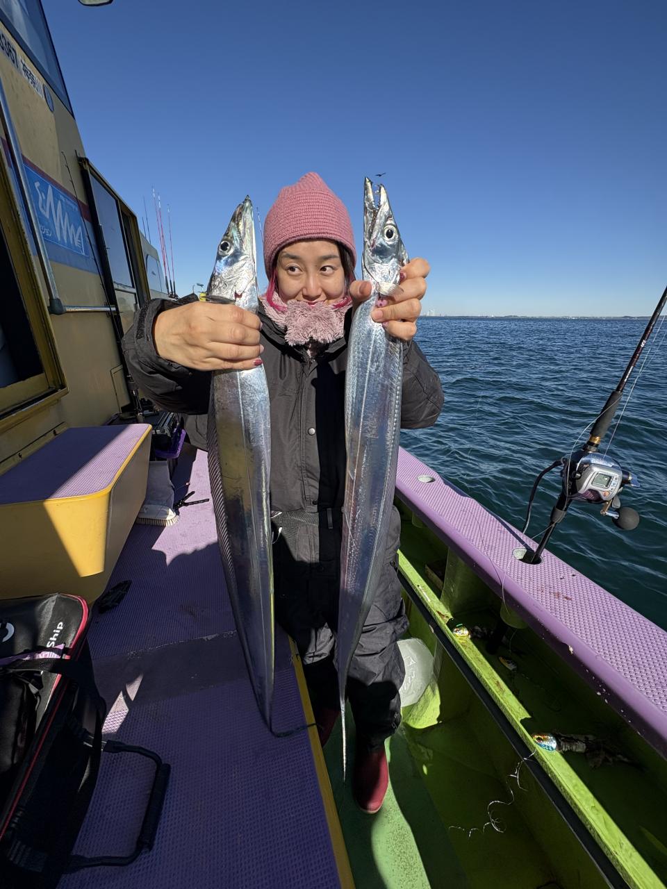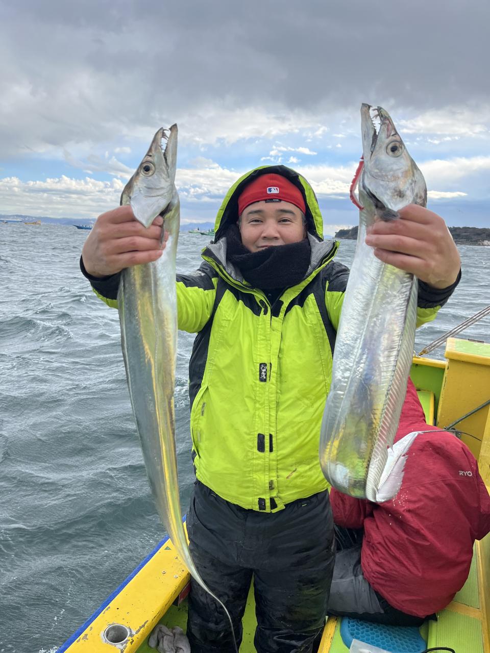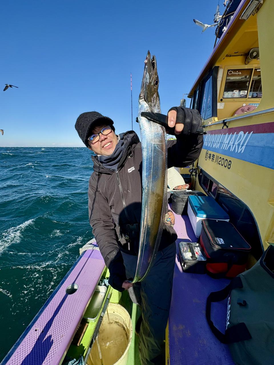 裕司船長、左舷側のお二人のお兄さん達、寒い中頑張ってレクチャー通りのロッドアクションでタチウオゲット✌️