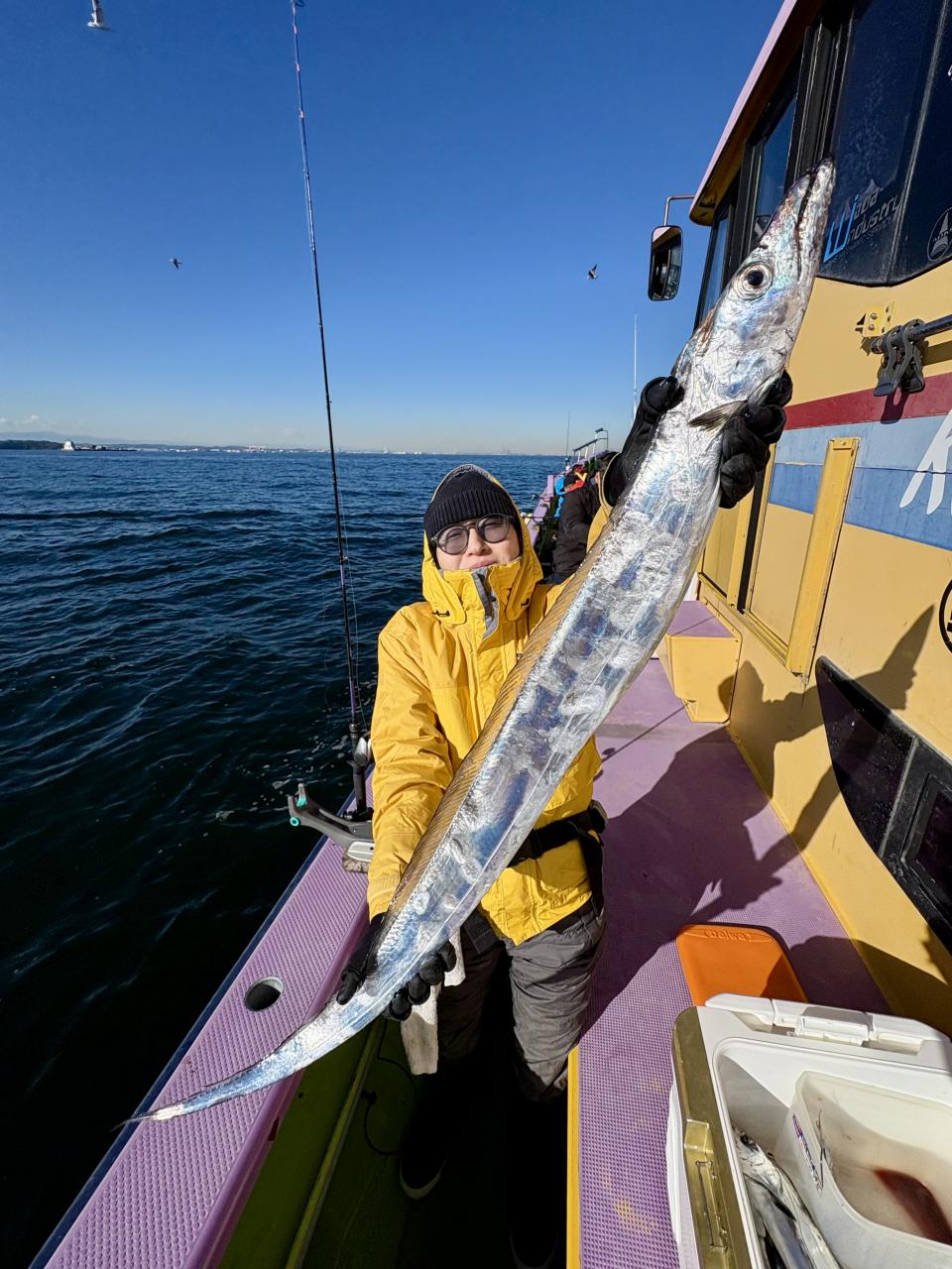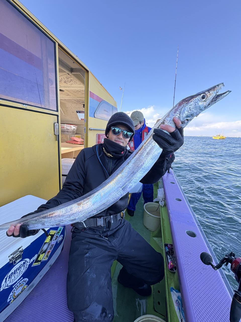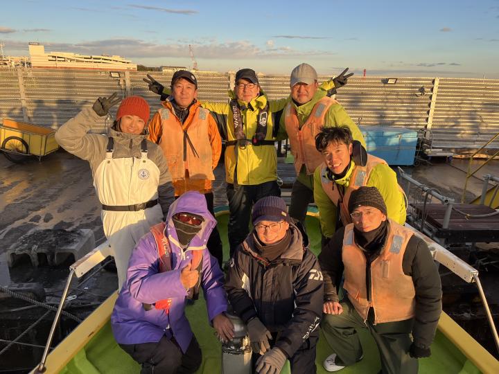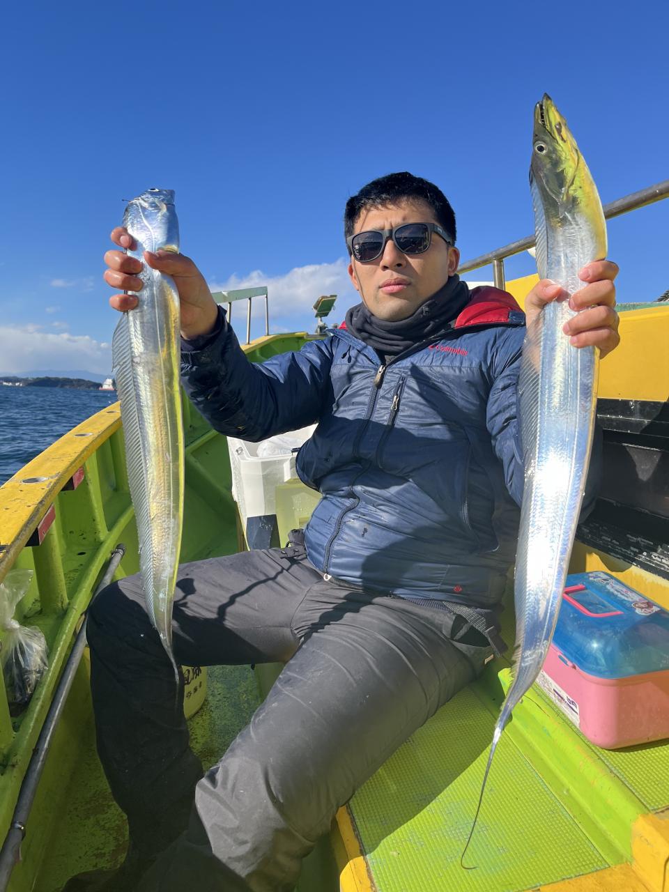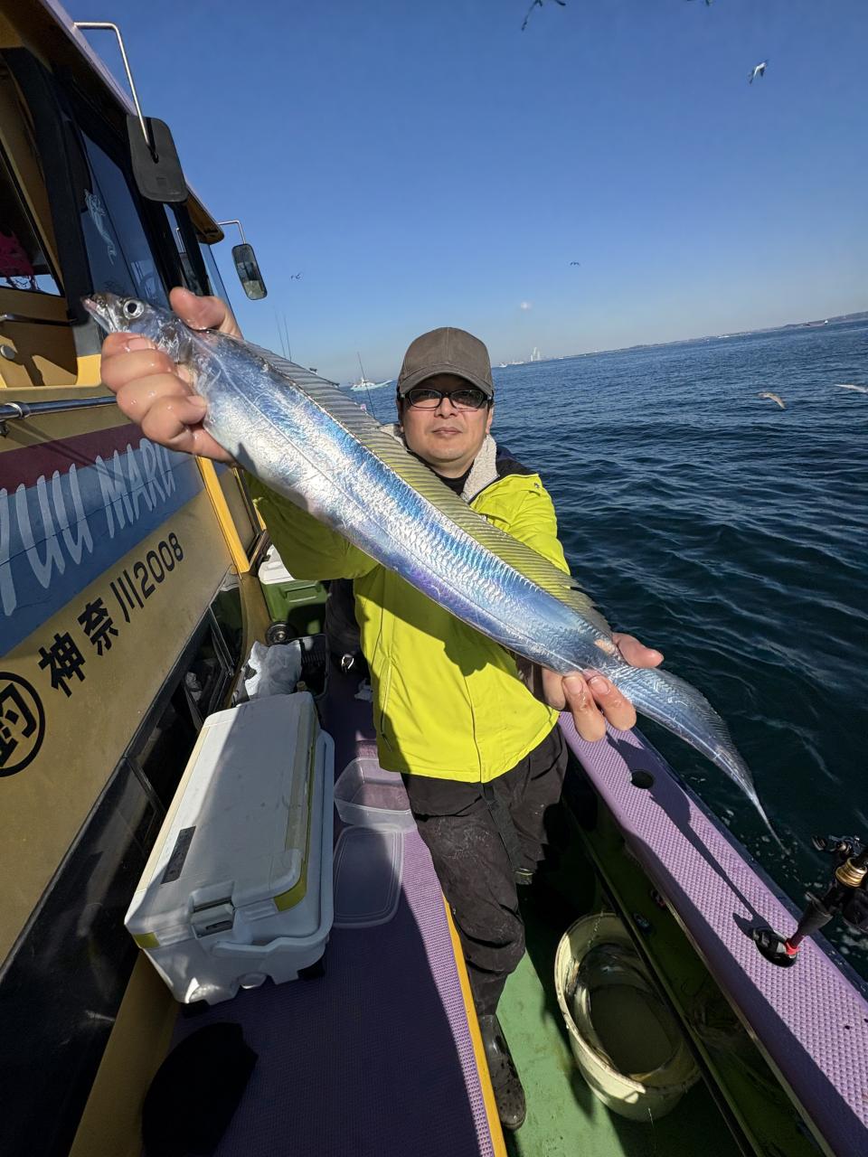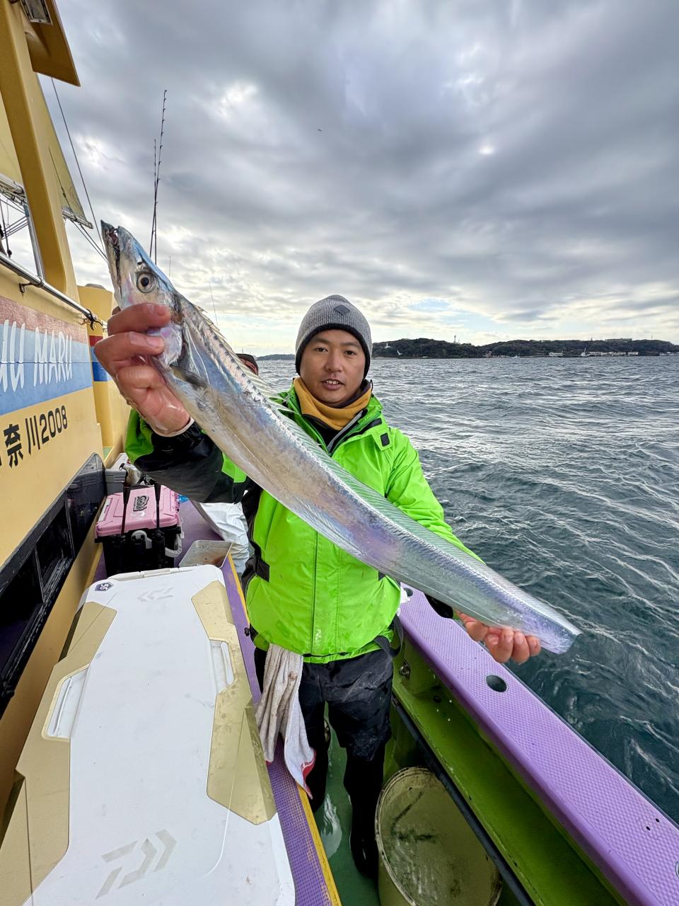 裕司船長、左舷側のお二人のお兄さん達、寒い中頑張ってレクチャー通りのロッドアクションでタチウオゲット✌️