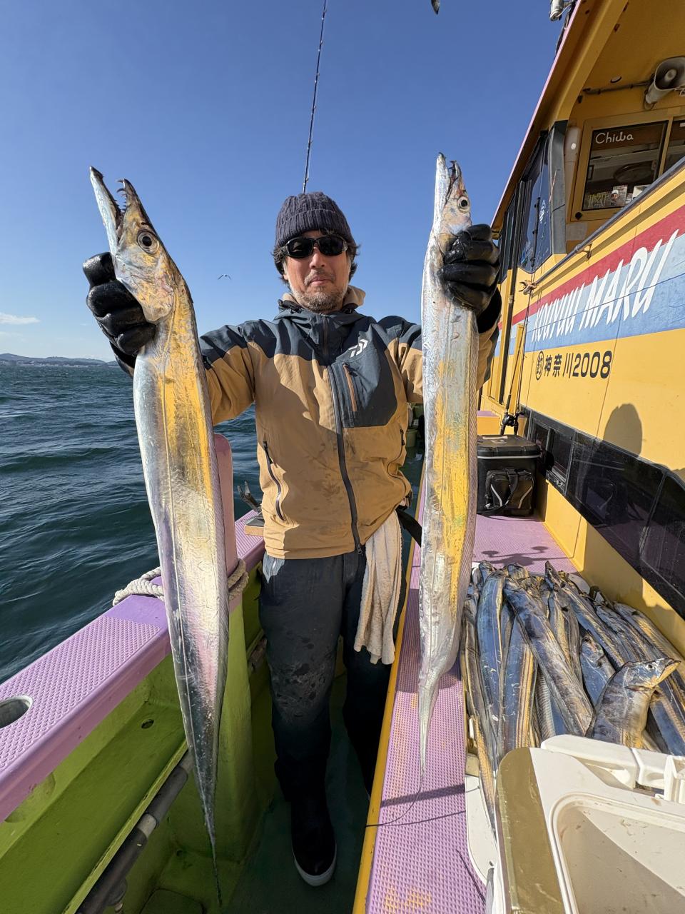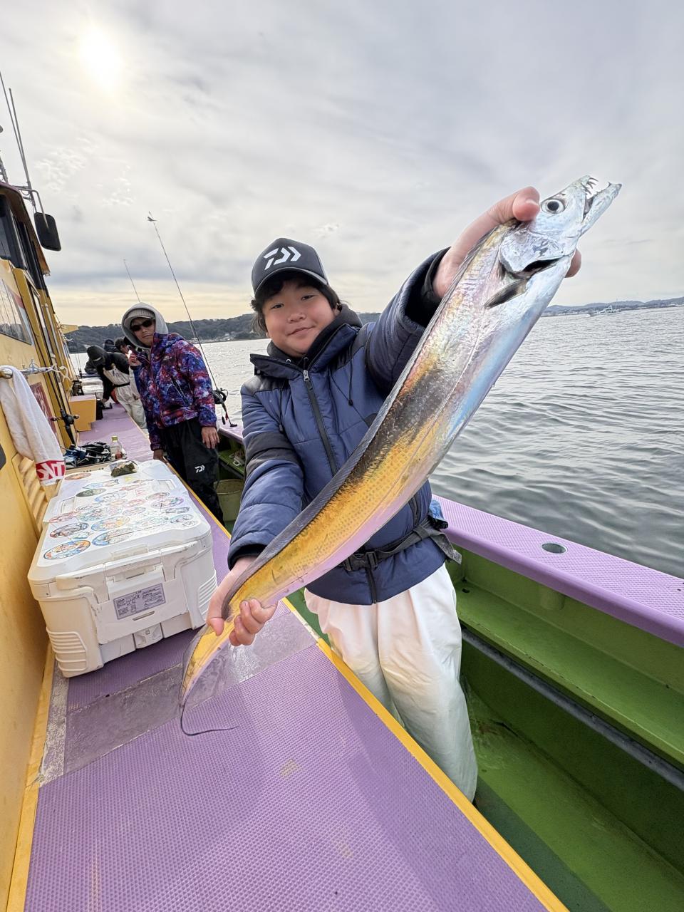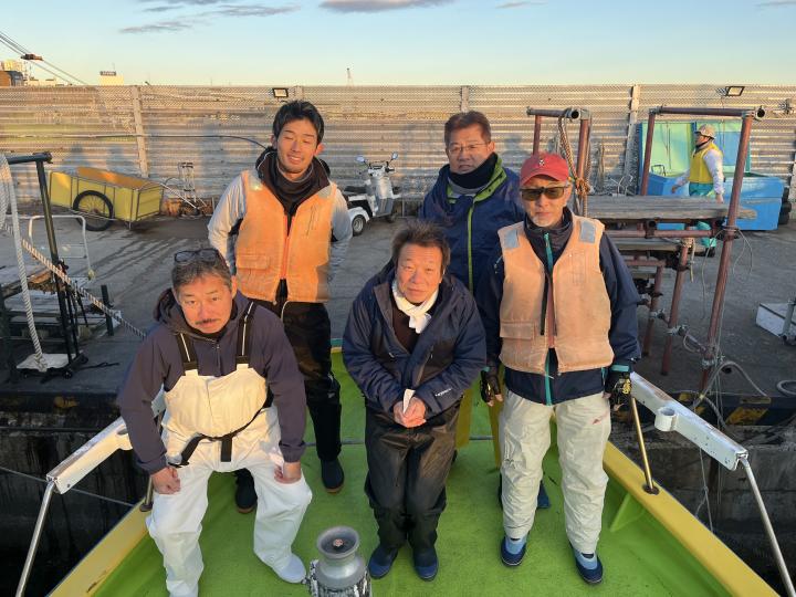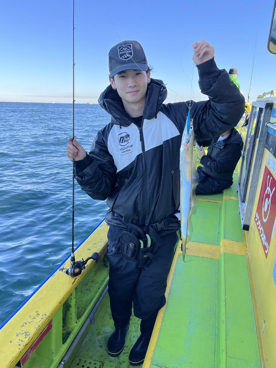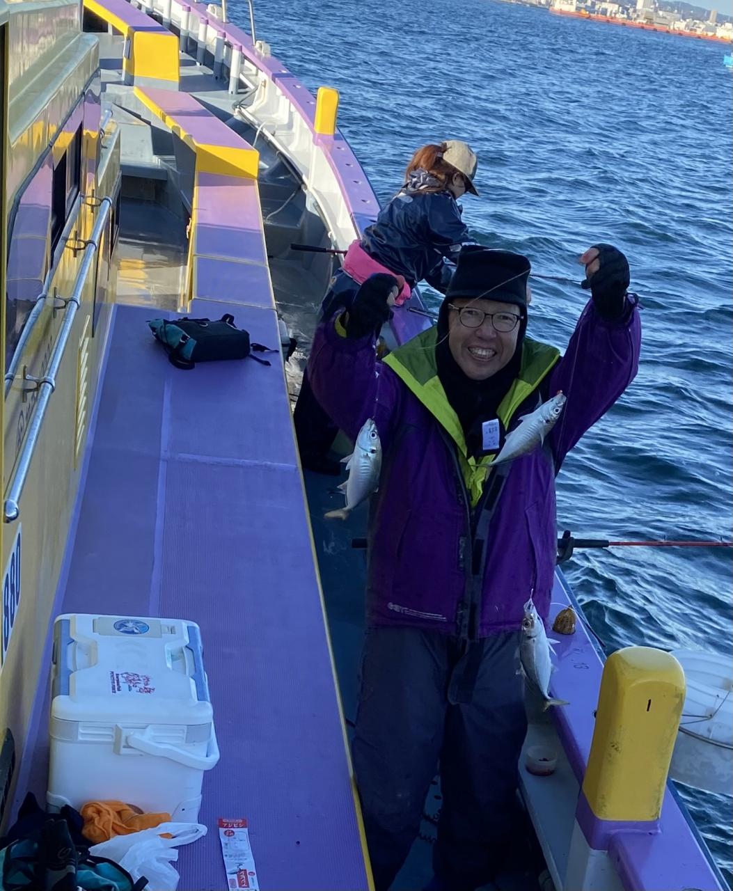裕司船長、左舷側のお二人のお兄さん達、寒い中頑張ってレクチャー通りのロッドアクションでタチウオゲット✌️