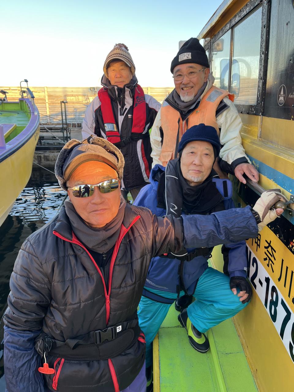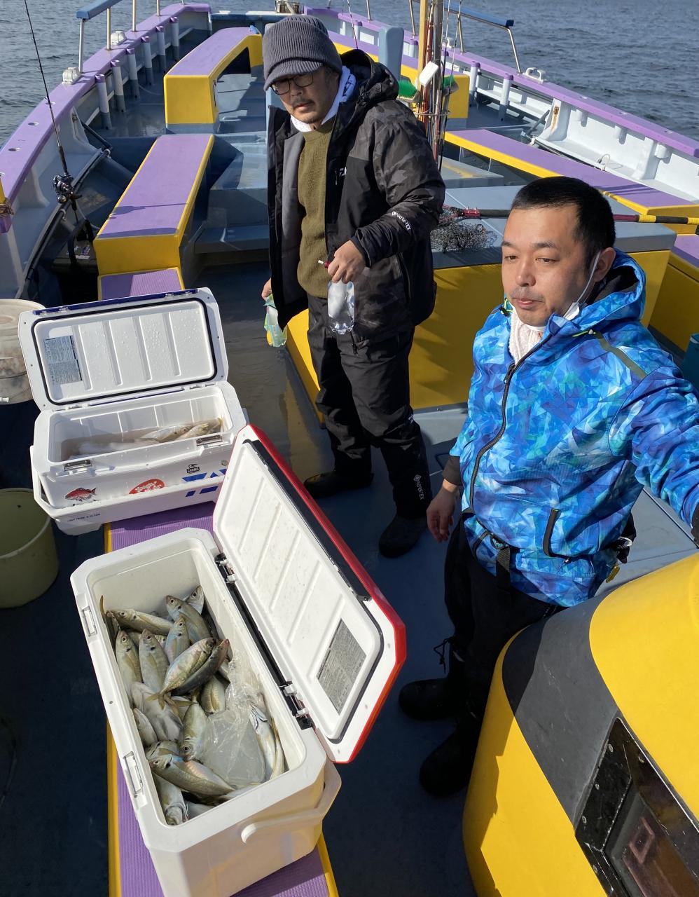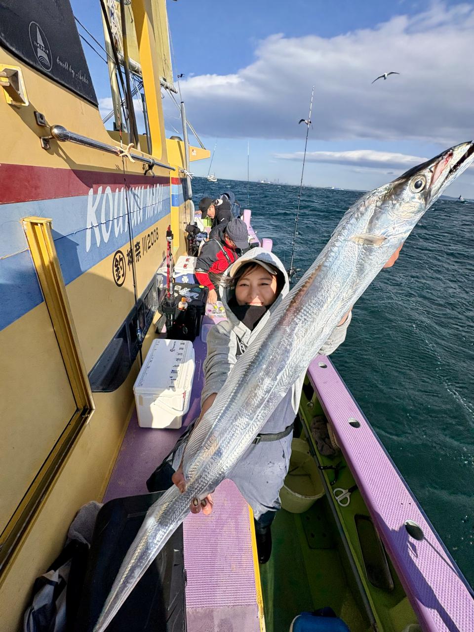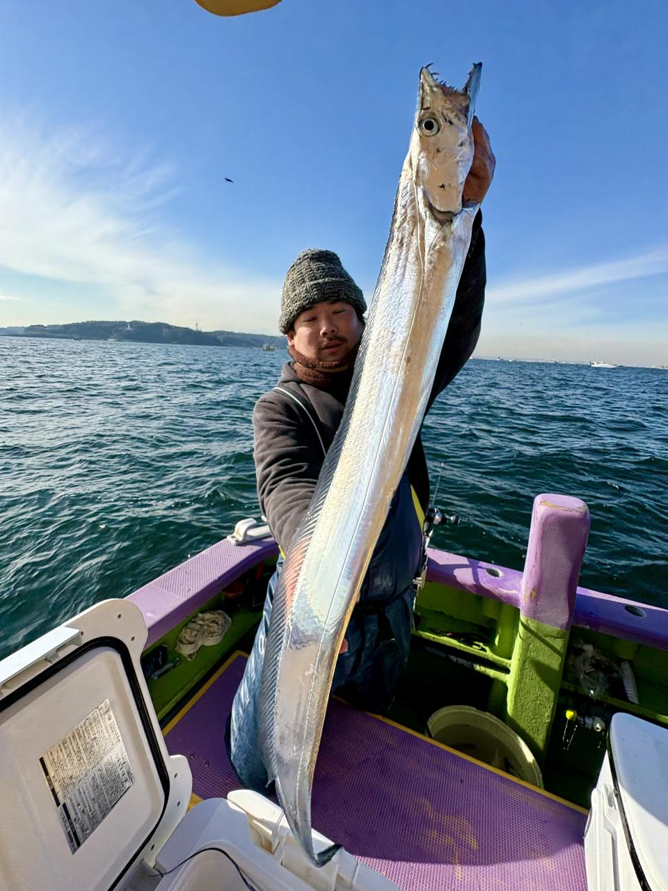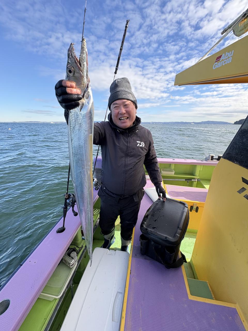 裕司船長、左舷側のお二人のお兄さん達、寒い中頑張ってレクチャー通りのロッドアクションでタチウオゲット✌️