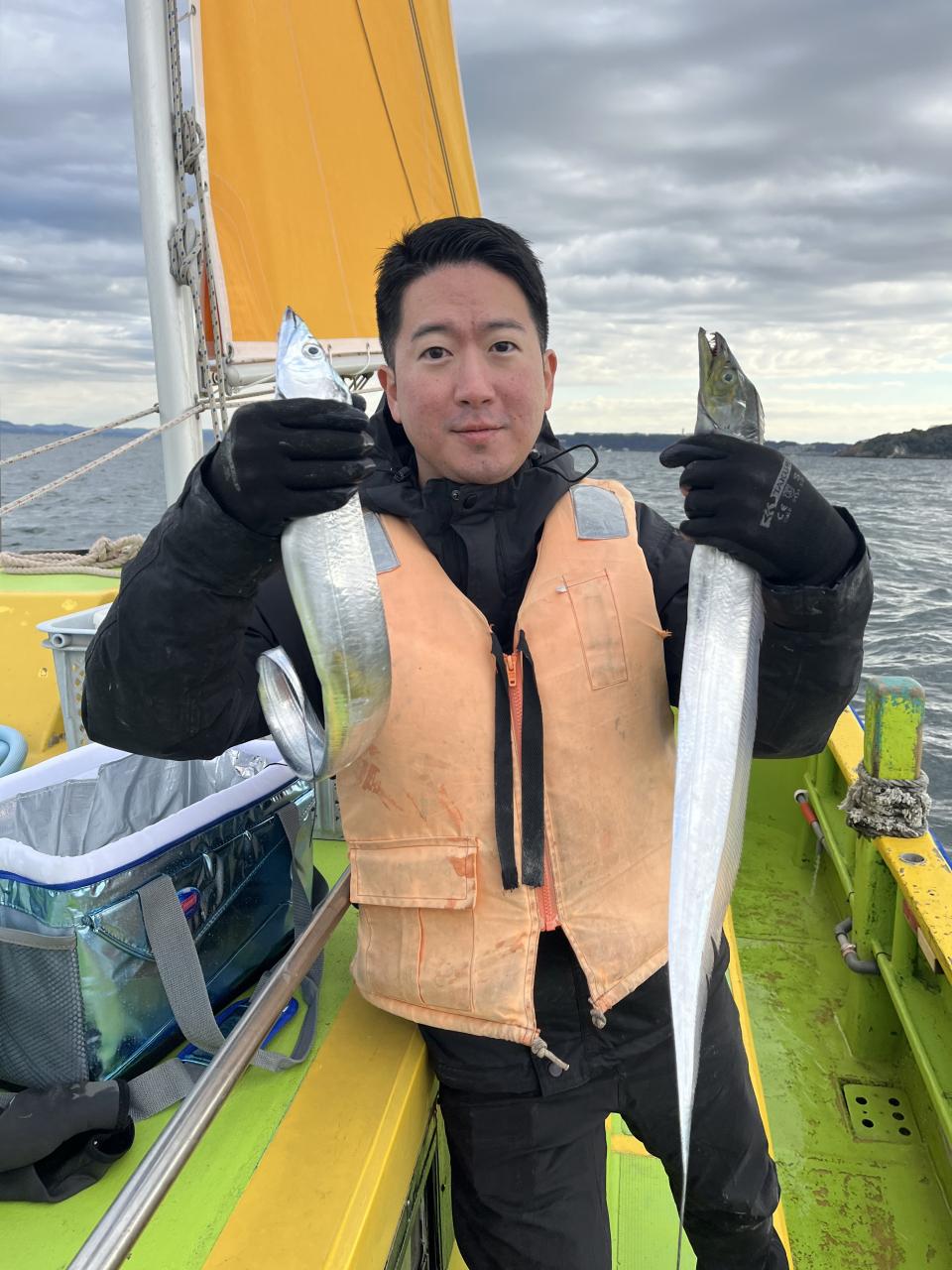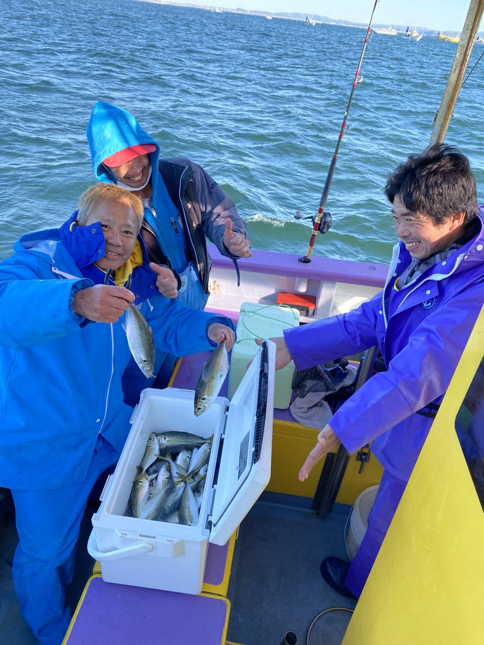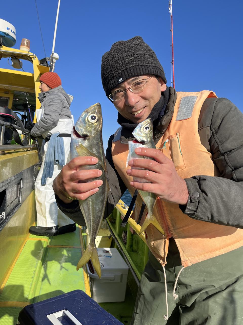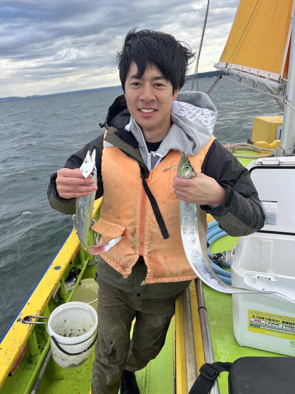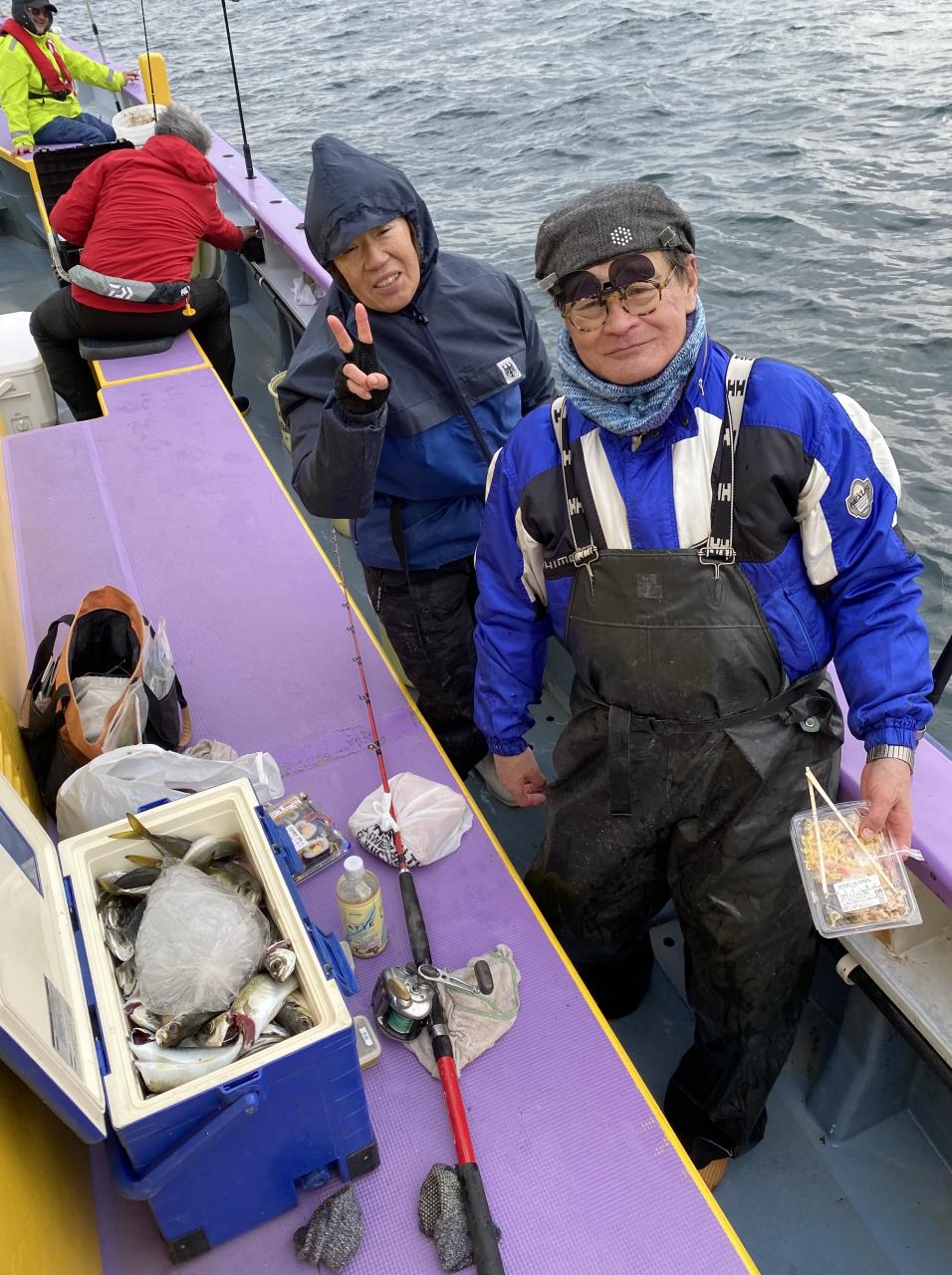 裕司船長、左舷側のお二人のお兄さん達、寒い中頑張ってレクチャー通りのロッドアクションでタチウオゲット✌️