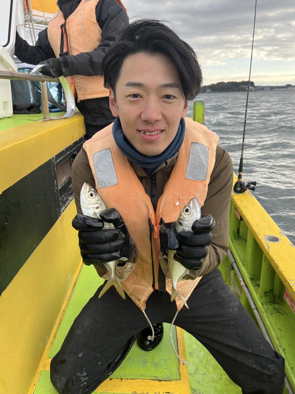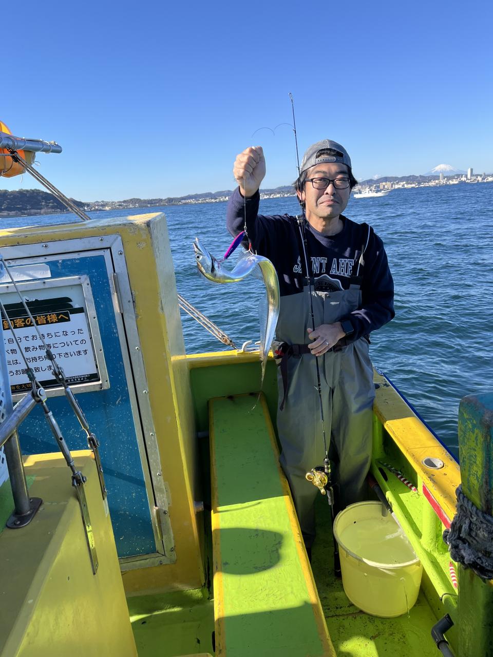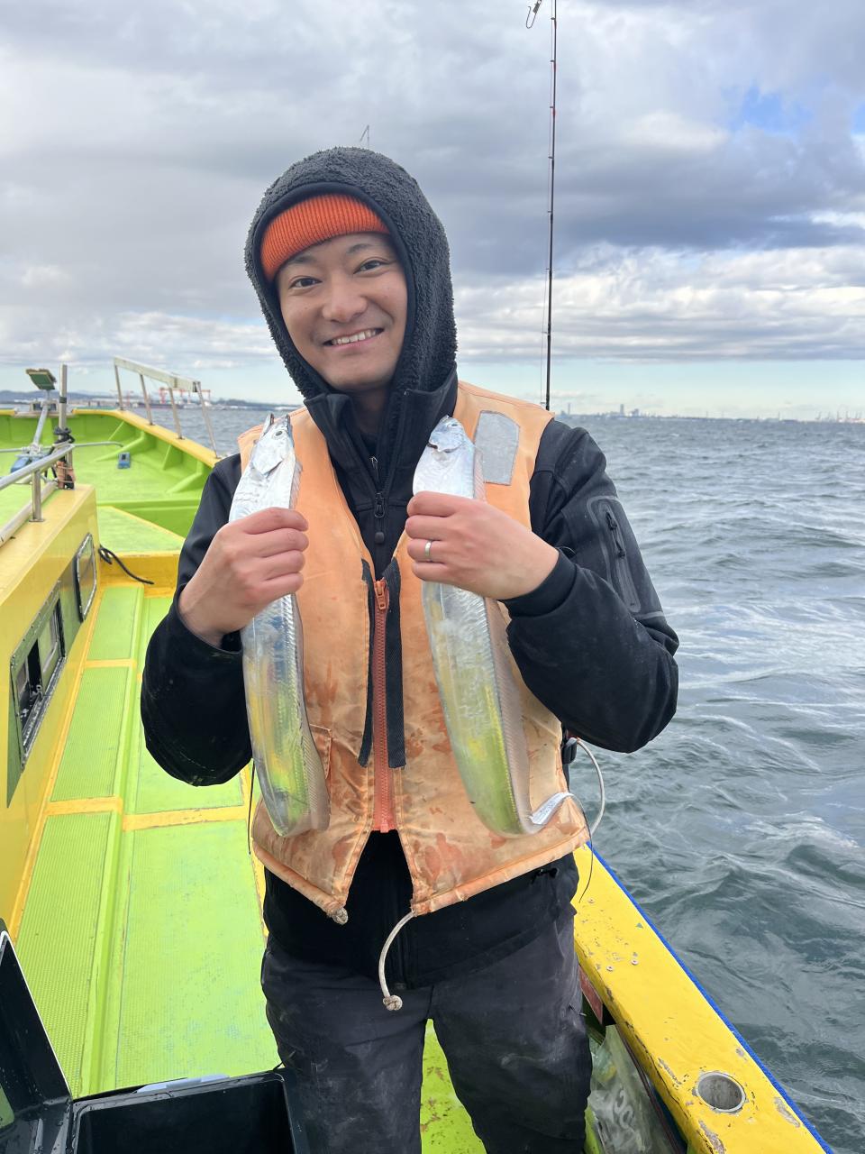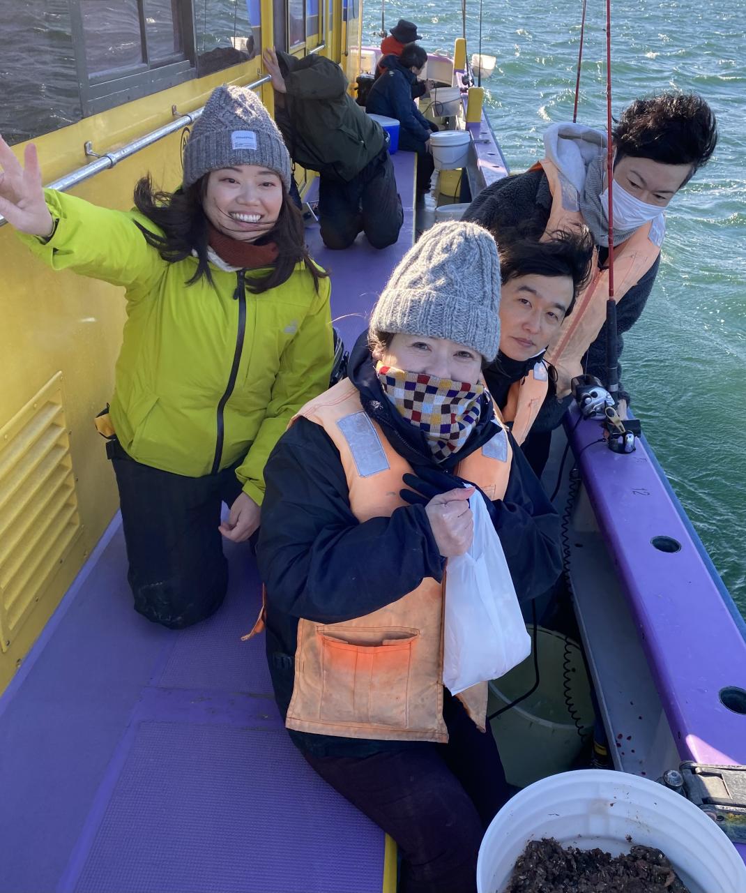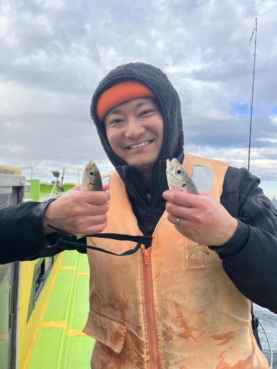 裕司船長、左舷側のお二人のお兄さん達、寒い中頑張ってレクチャー通りのロッドアクションでタチウオゲット✌️