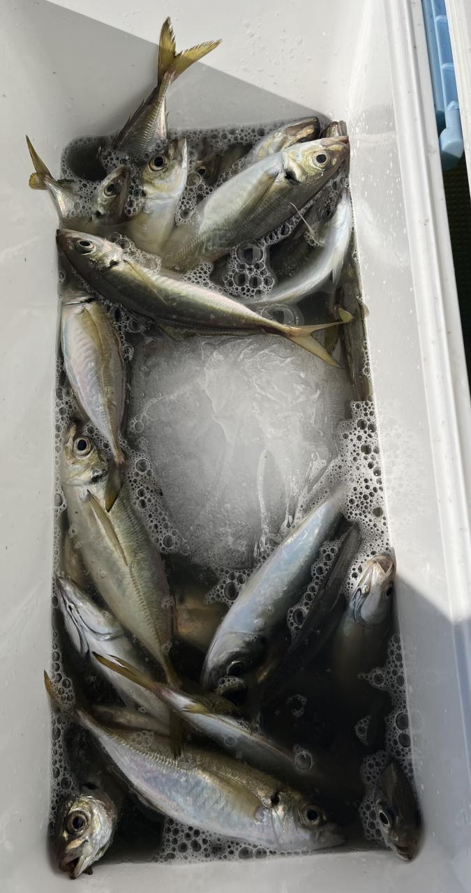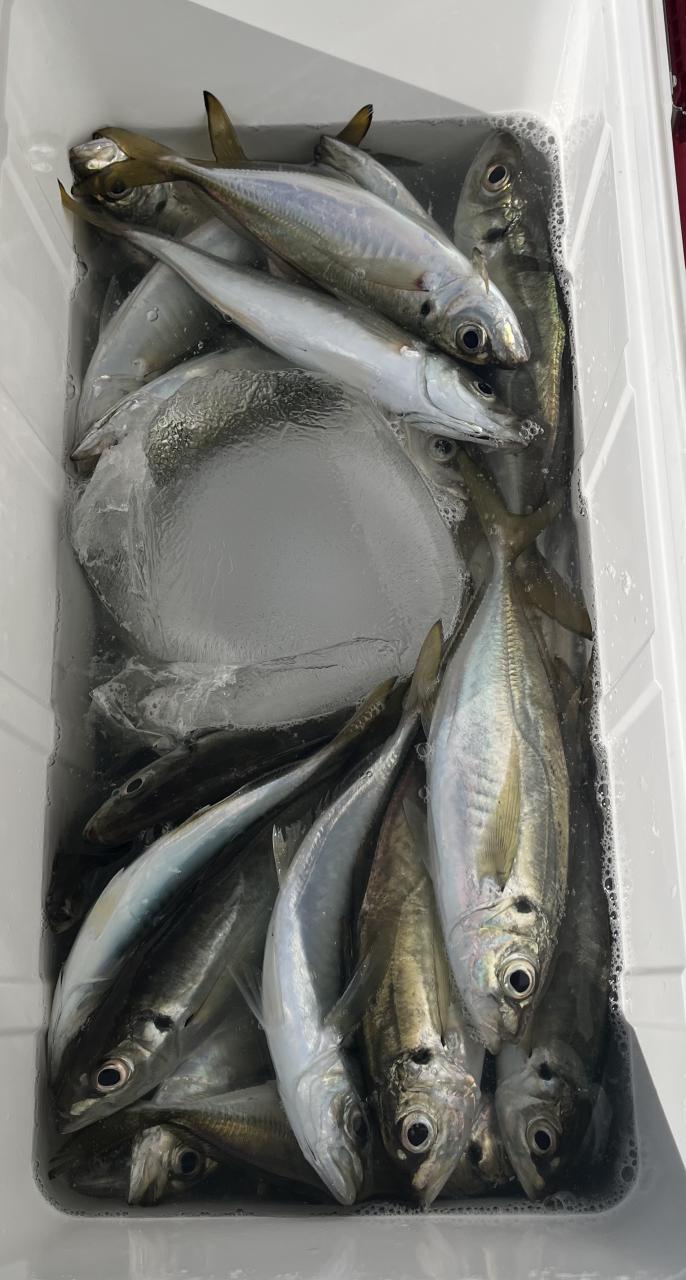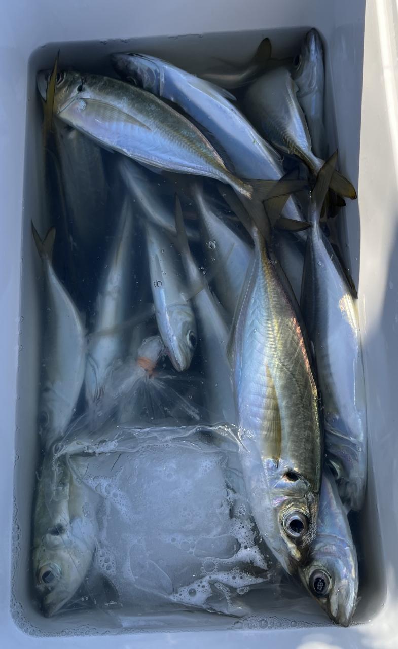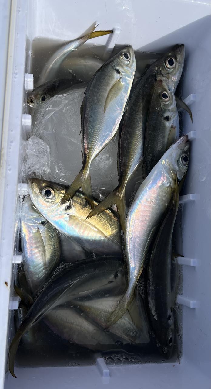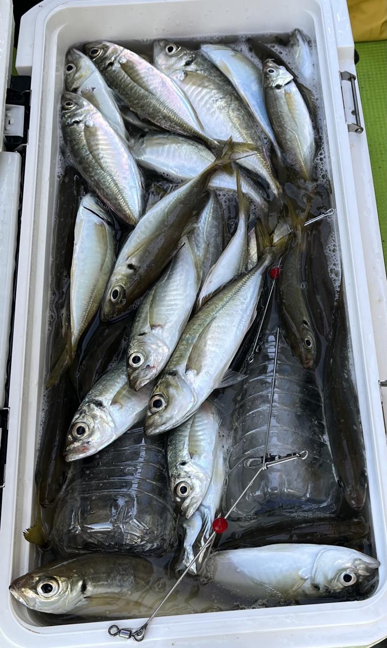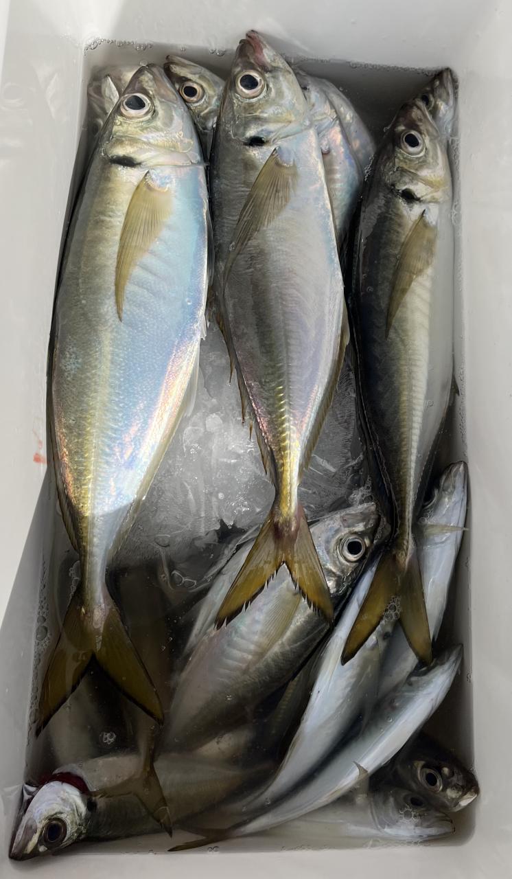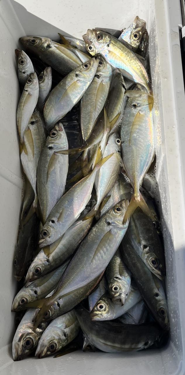 朝のうちは昨日釣れた様な大型アジ狙いでチャレンジも大型アジの水面バラシのみで、型見たのは中アジでダブルもありましたが後々が無く、昨日後半のポイントもやりたかったんですが仲間の「型見れてます❗️」とのお言葉に甘えて大移動して沖上がりまで移動なくやれました⭕️