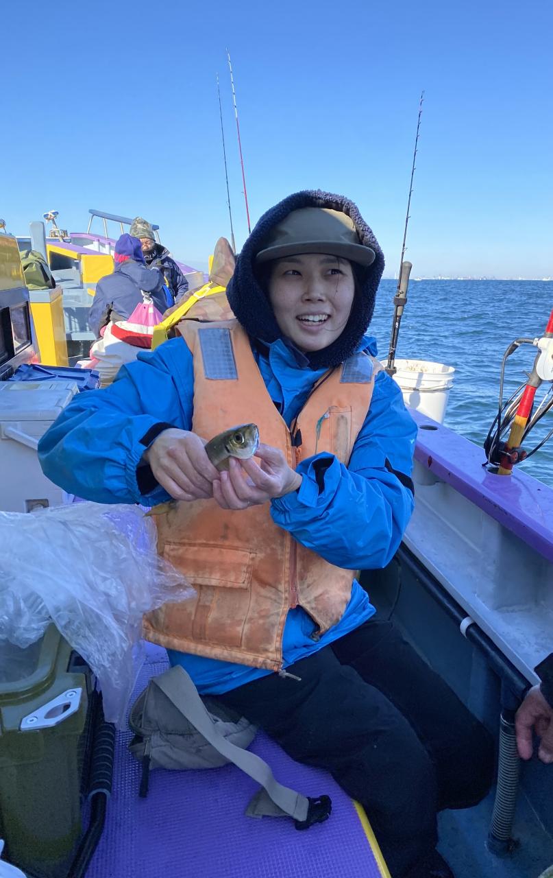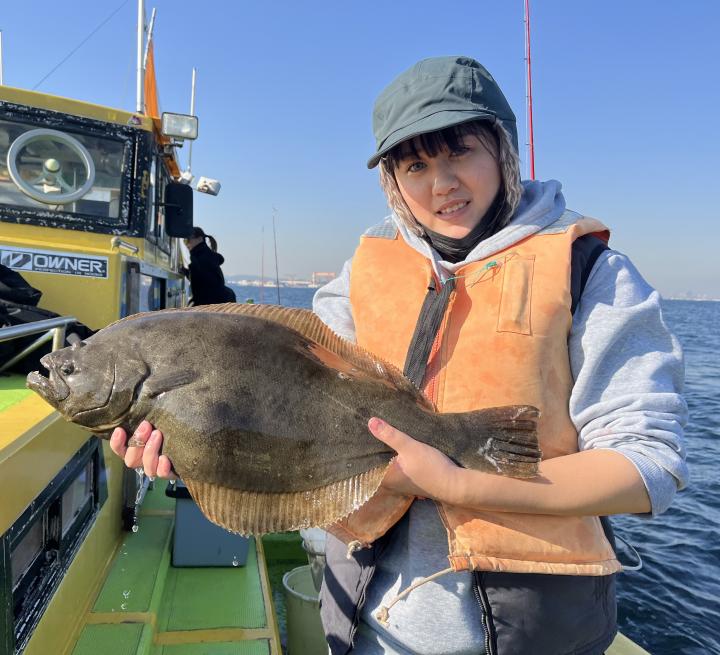 裕司船長の下に釣り座を構えていた、デビュー戦の「娘さん」何とハリス2号でヒラメをゲット✌️