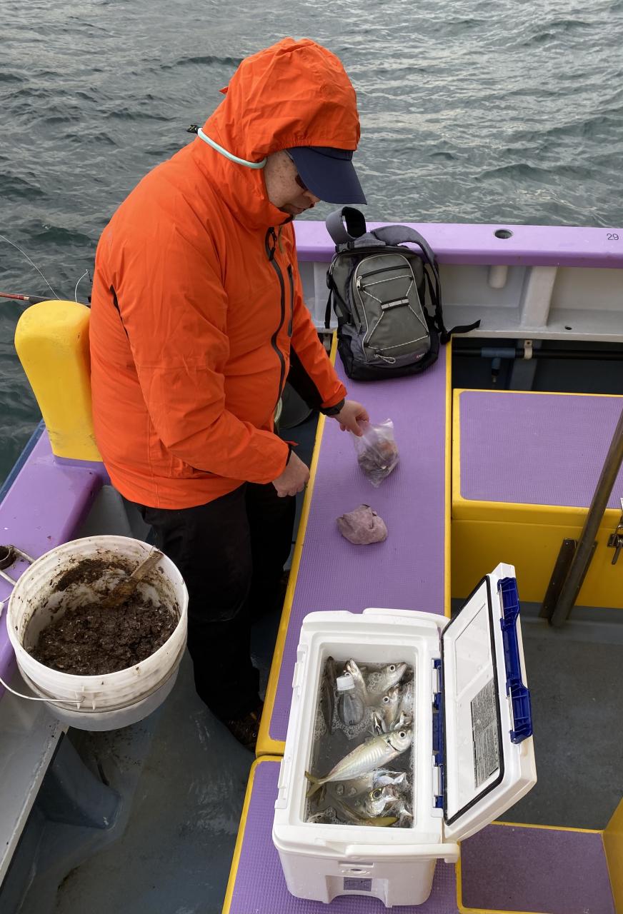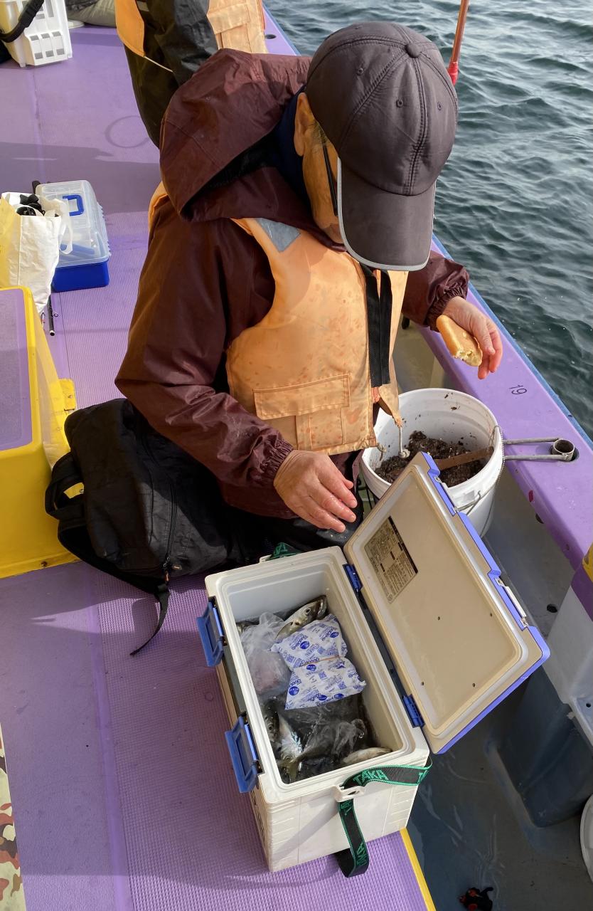 ビギナーさん釣行のコースとは違うコースでの実釣パターンでのポイント選び、海水温度も15°台と前回出船時よりも1°近く低いです❌寒い朝、低い反応からの実釣開始コマセを撒いて様子見です、低い反応は入って来るも音信無し・・・。
