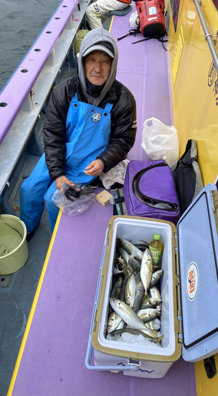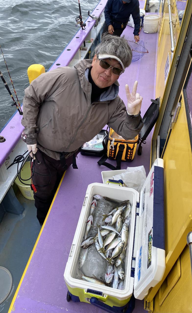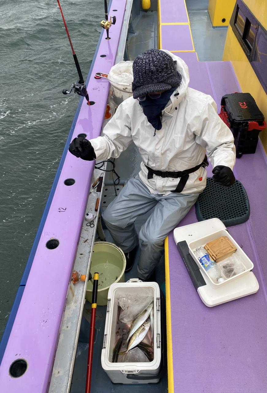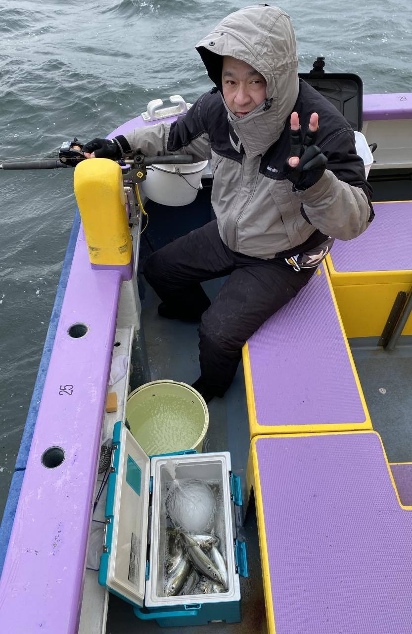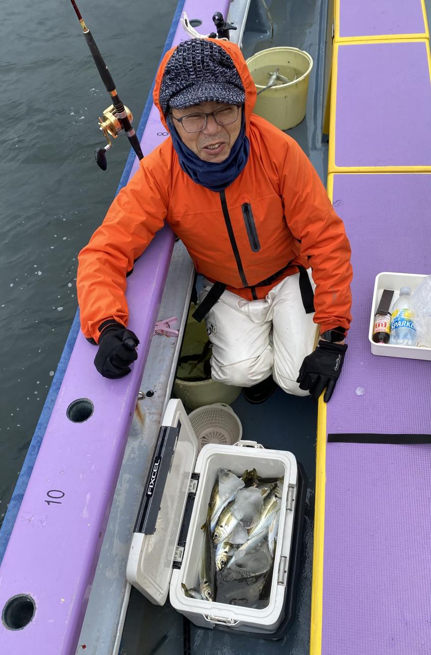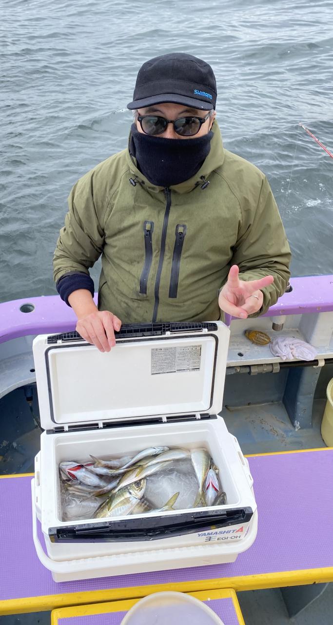 今日は、雨予報?寂しく3名様での出船でした。下げ潮は速いが手慣れた方だったので助かりました。アジ型を出すと25センチ28センチ30センチクラスに35センチオーバーも交じって型を出す!が、雨と北風が強くなりお昼過ぎに沖上がり致しました。雨、風で風邪ひかない様にして下さい。