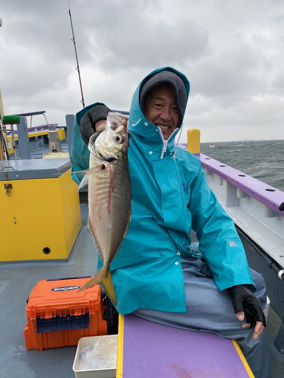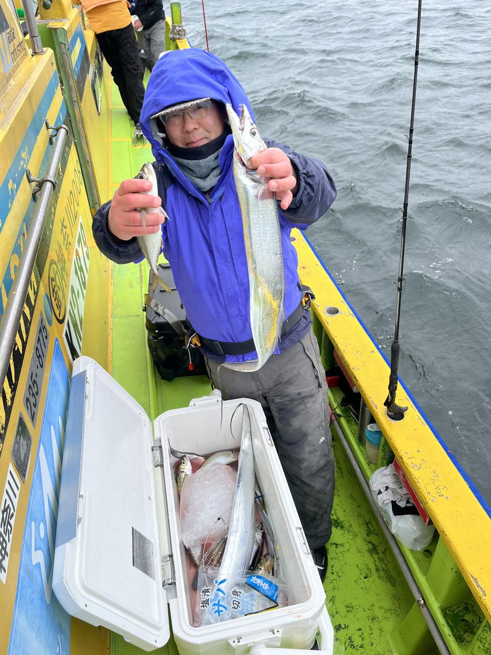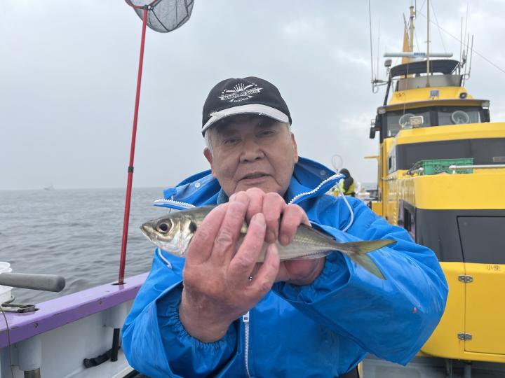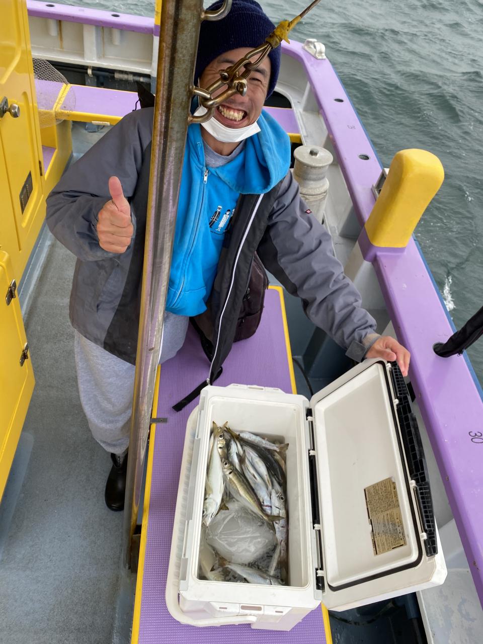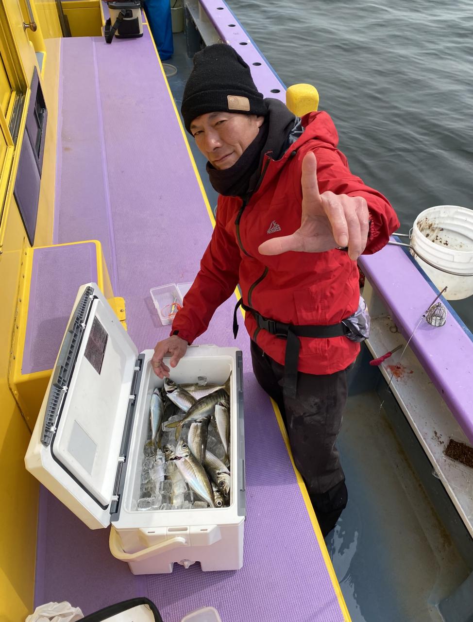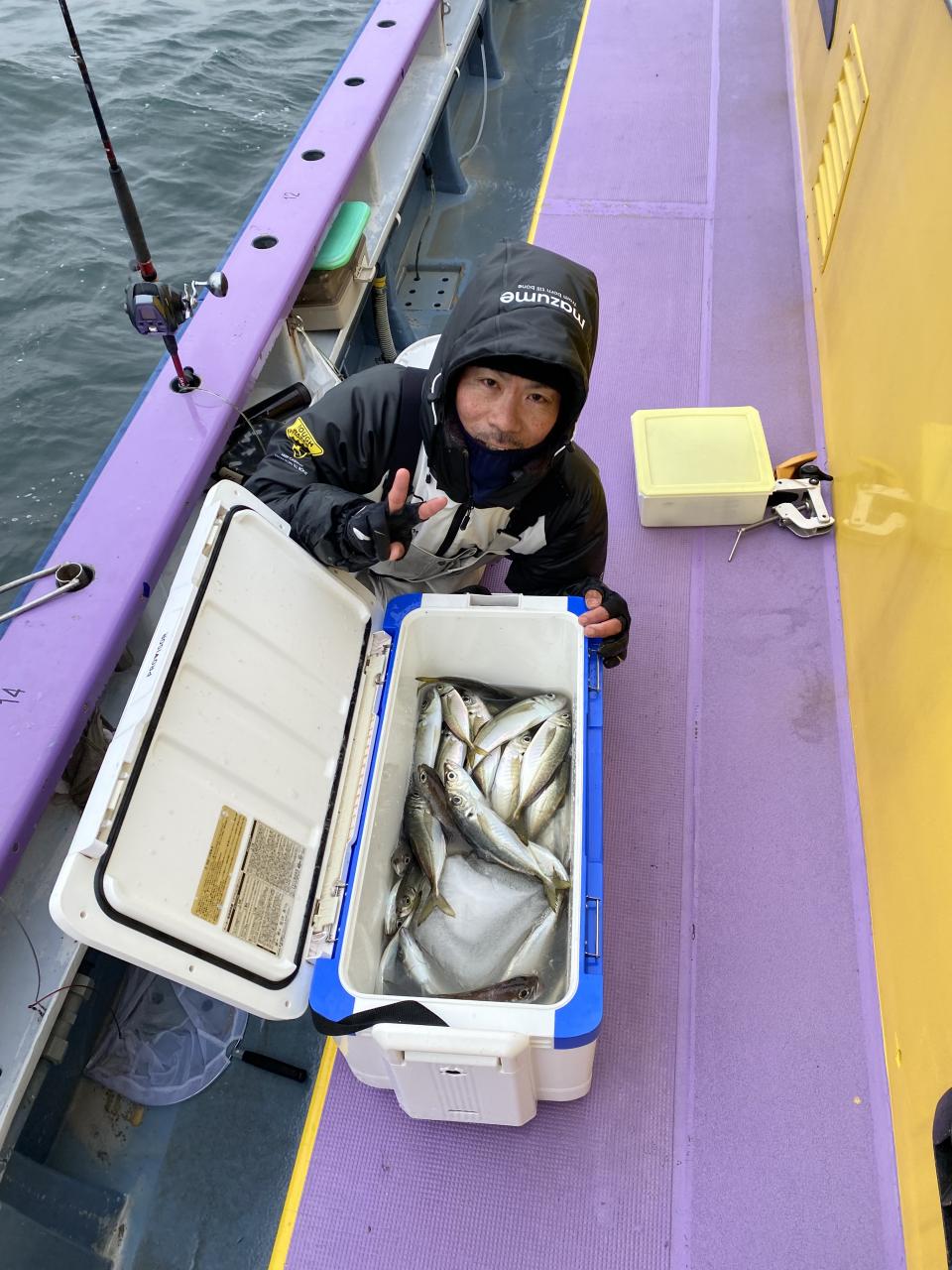 今日は、雨予報?寂しく3名様での出船でした。下げ潮は速いが手慣れた方だったので助かりました。アジ型を出すと25センチ28センチ30センチクラスに35センチオーバーも交じって型を出す!が、雨と北風が強くなりお昼過ぎに沖上がり致しました。雨、風で風邪ひかない様にして下さい。