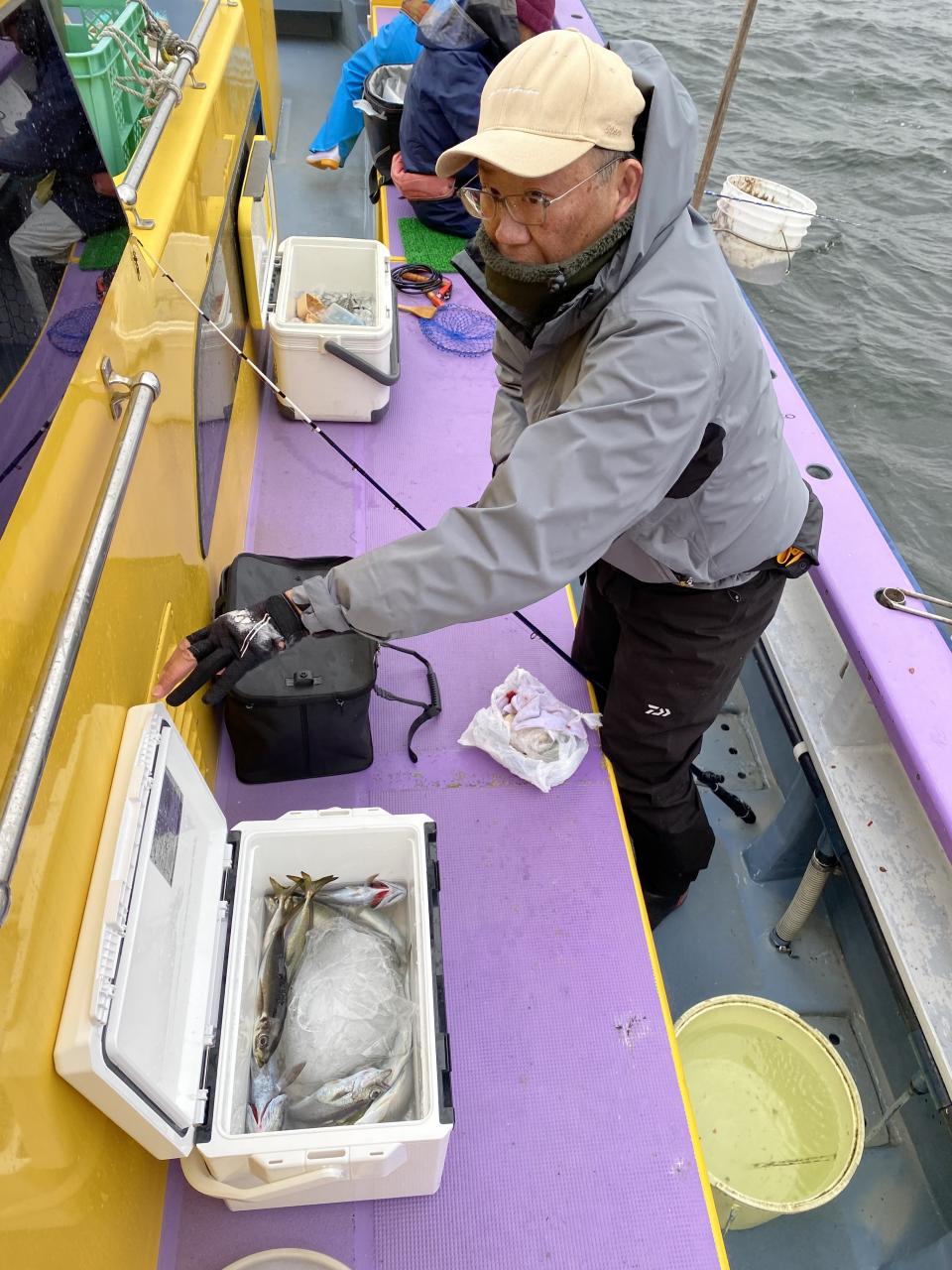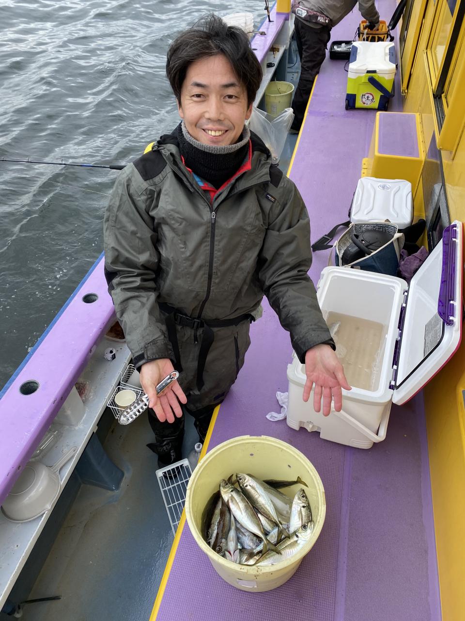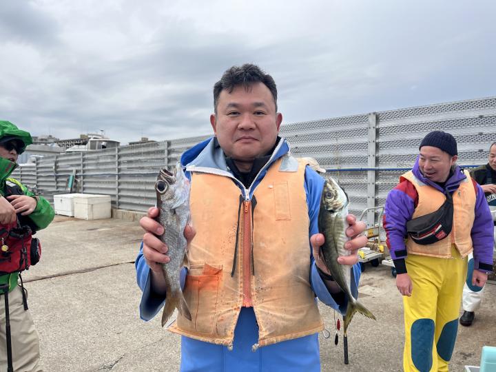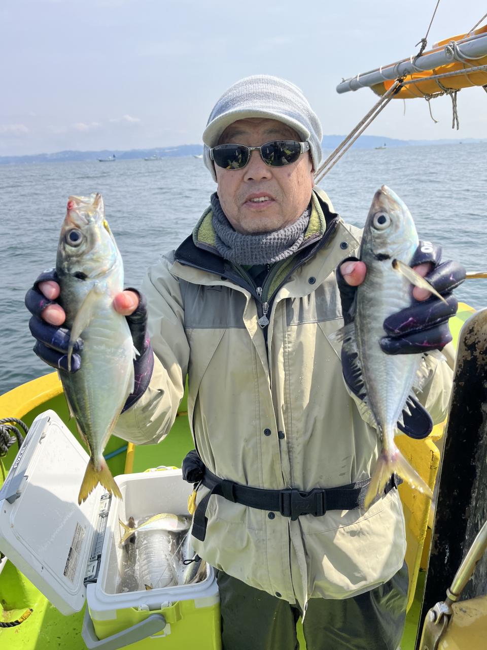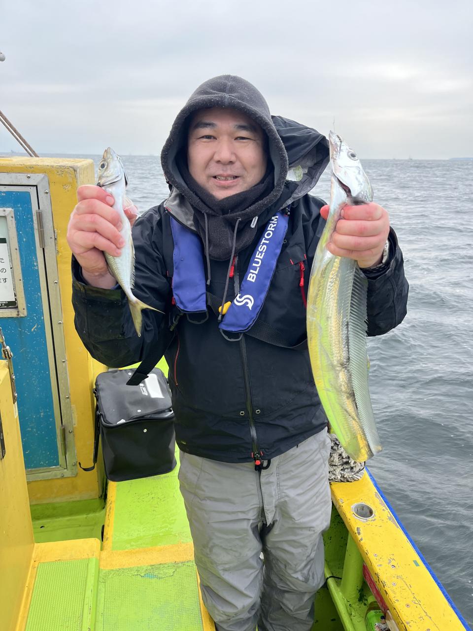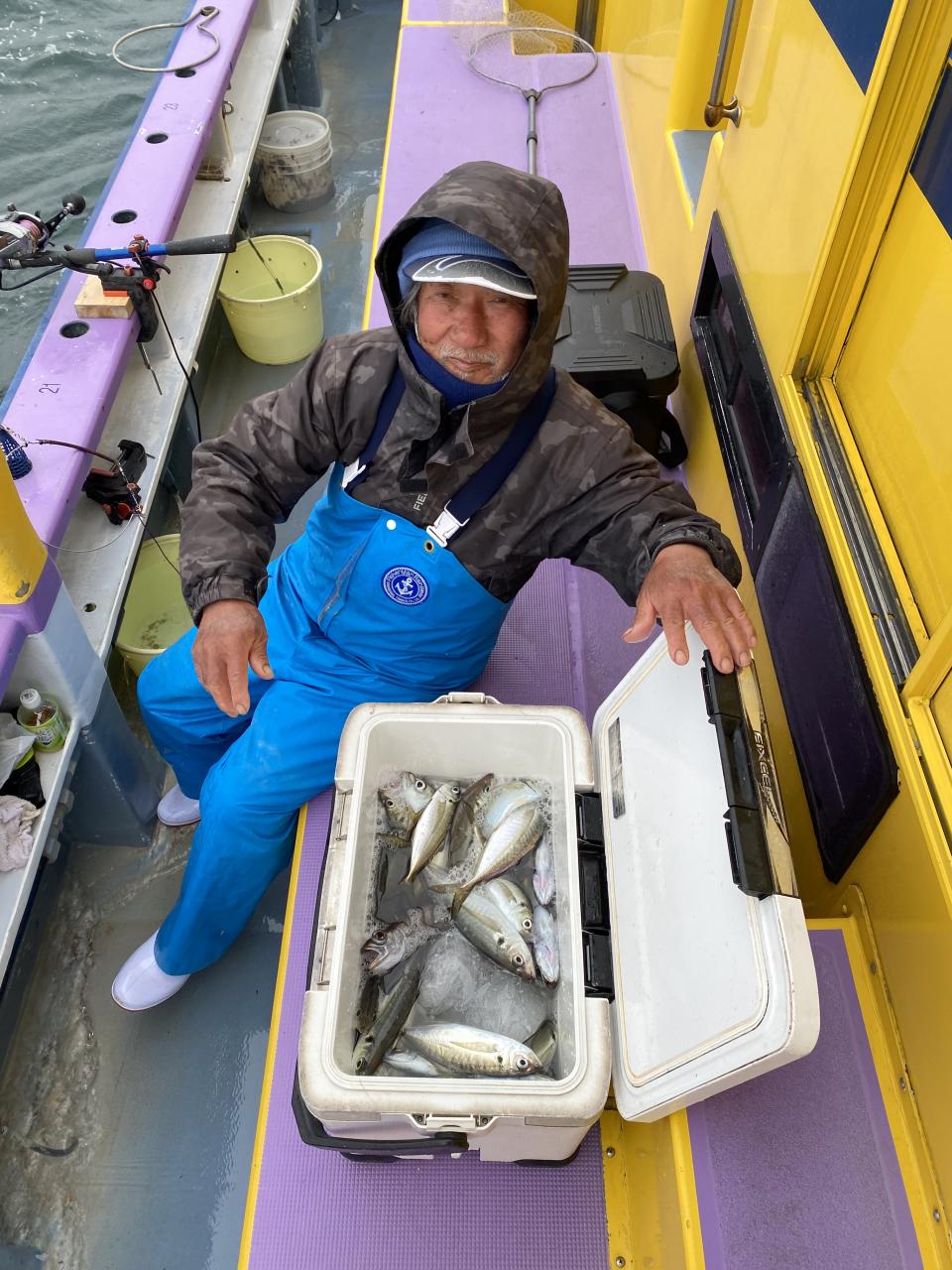 今日は、雨予報?寂しく3名様での出船でした。下げ潮は速いが手慣れた方だったので助かりました。アジ型を出すと25センチ28センチ30センチクラスに35センチオーバーも交じって型を出す!が、雨と北風が強くなりお昼過ぎに沖上がり致しました。雨、風で風邪ひかない様にして下さい。