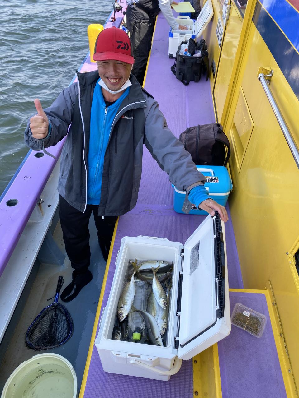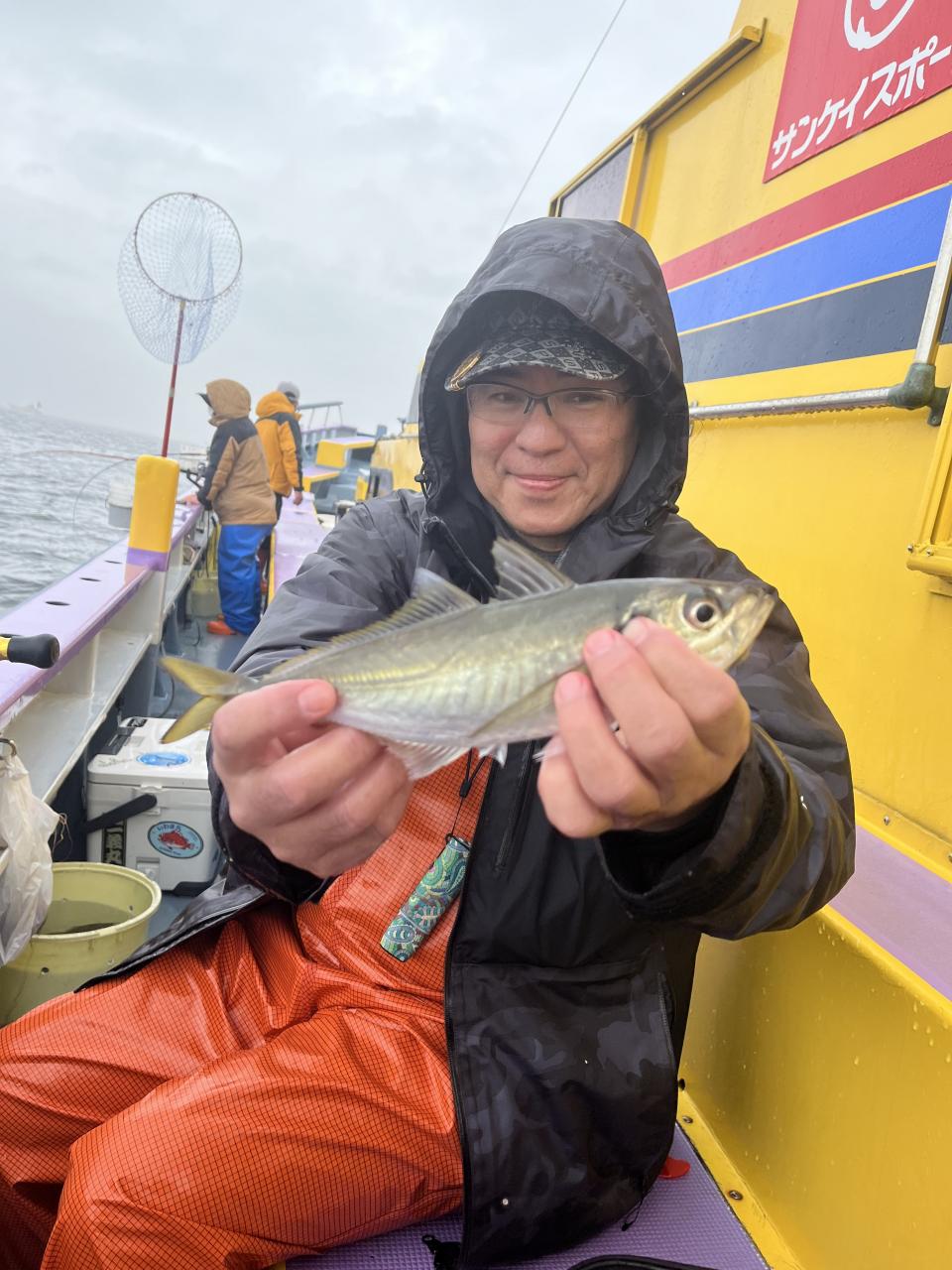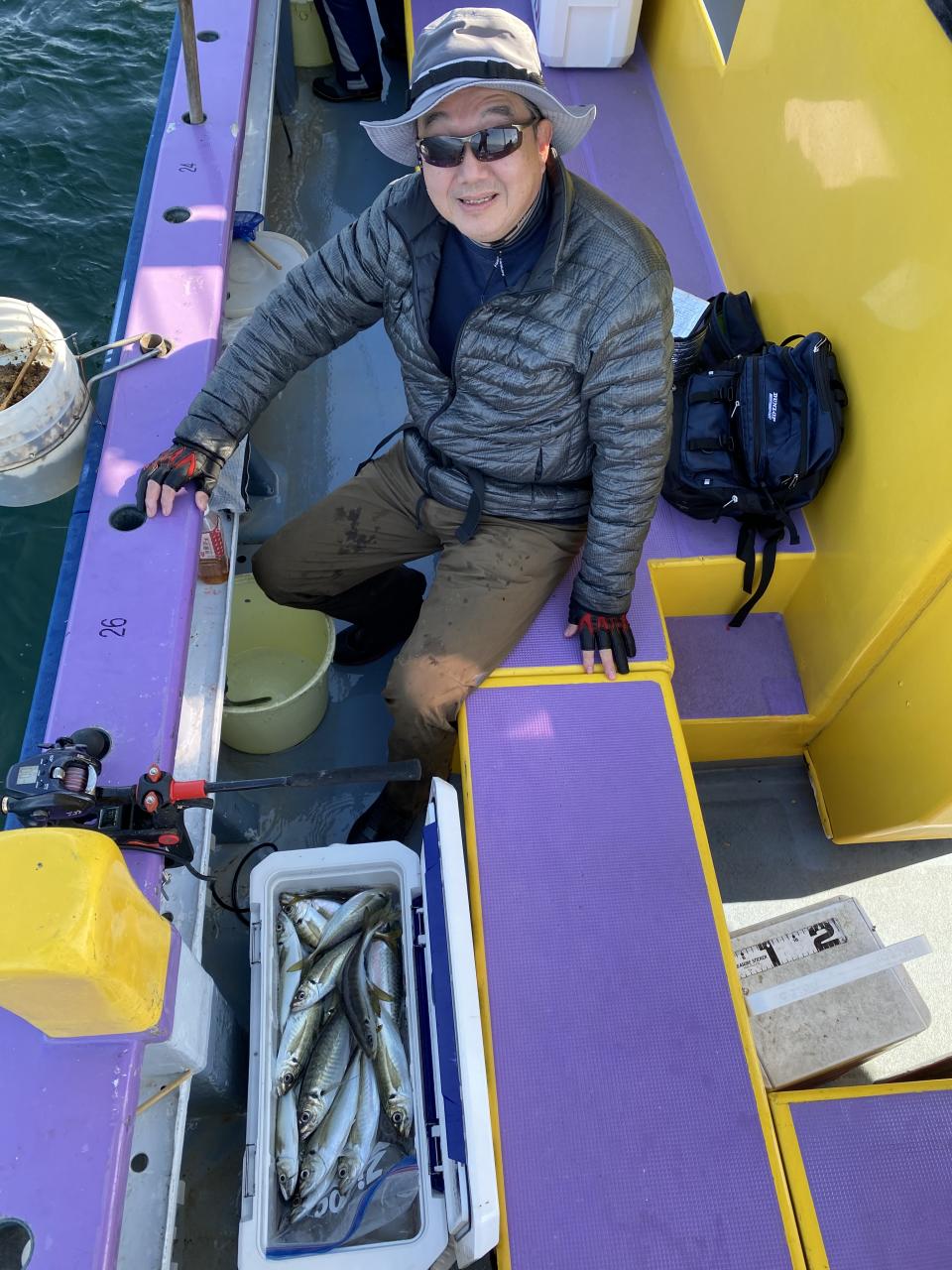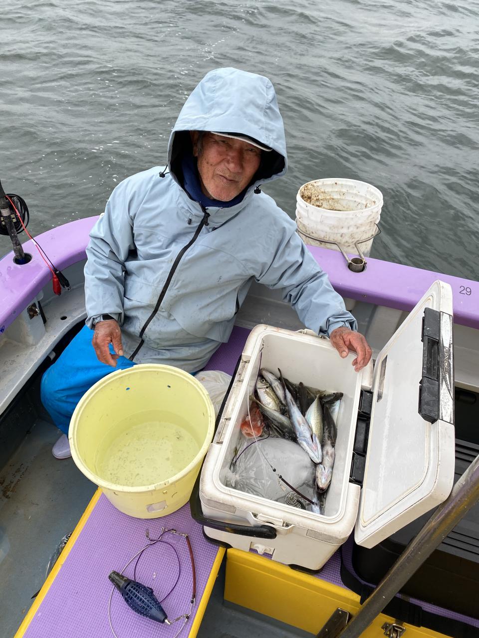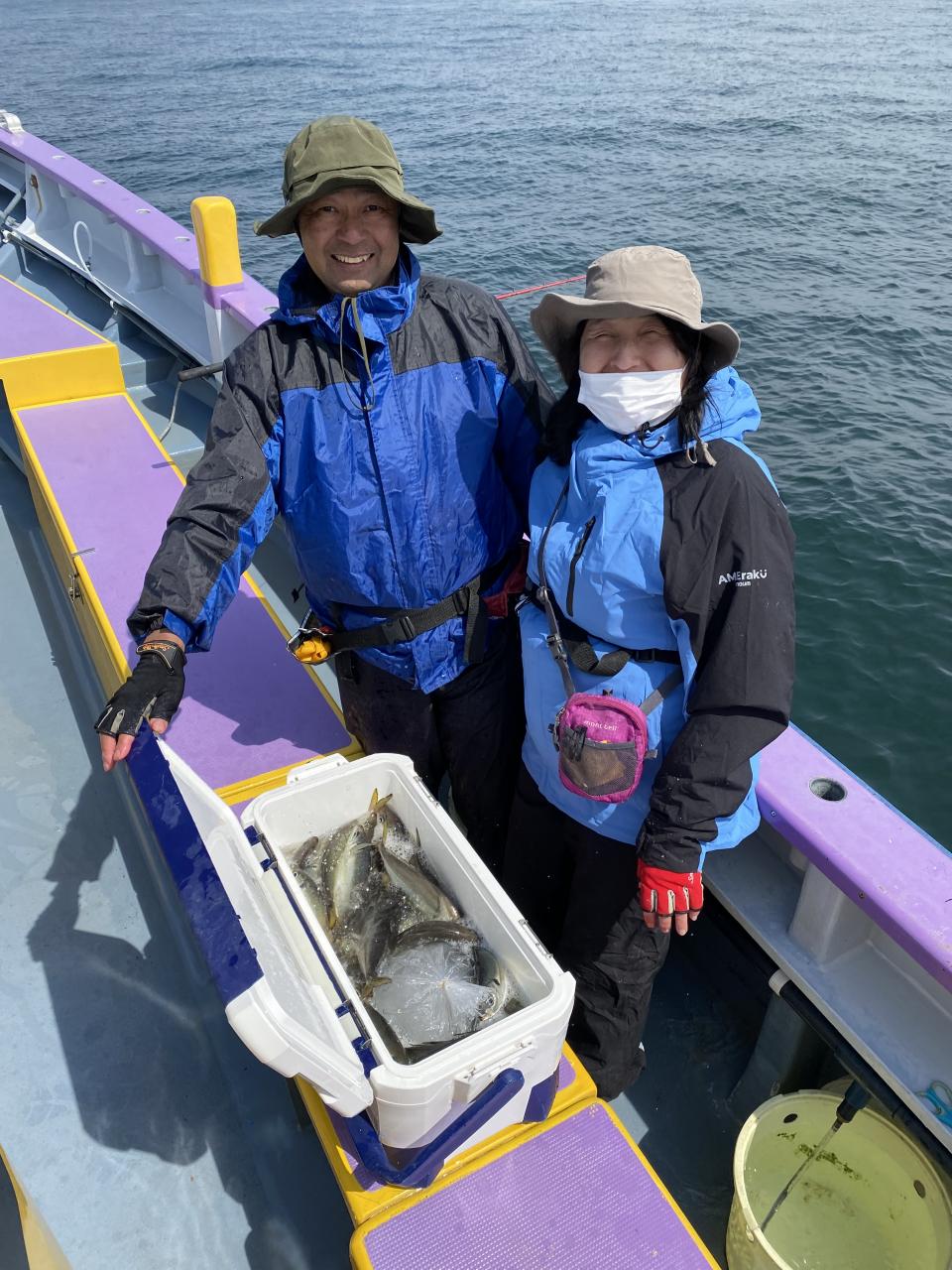今日は、雨予報?寂しく3名様での出船でした。下げ潮は速いが手慣れた方だったので助かりました。アジ型を出すと25センチ28センチ30センチクラスに35センチオーバーも交じって型を出す!が、雨と北風が強くなりお昼過ぎに沖上がり致しました。雨、風で風邪ひかない様にして下さい。
