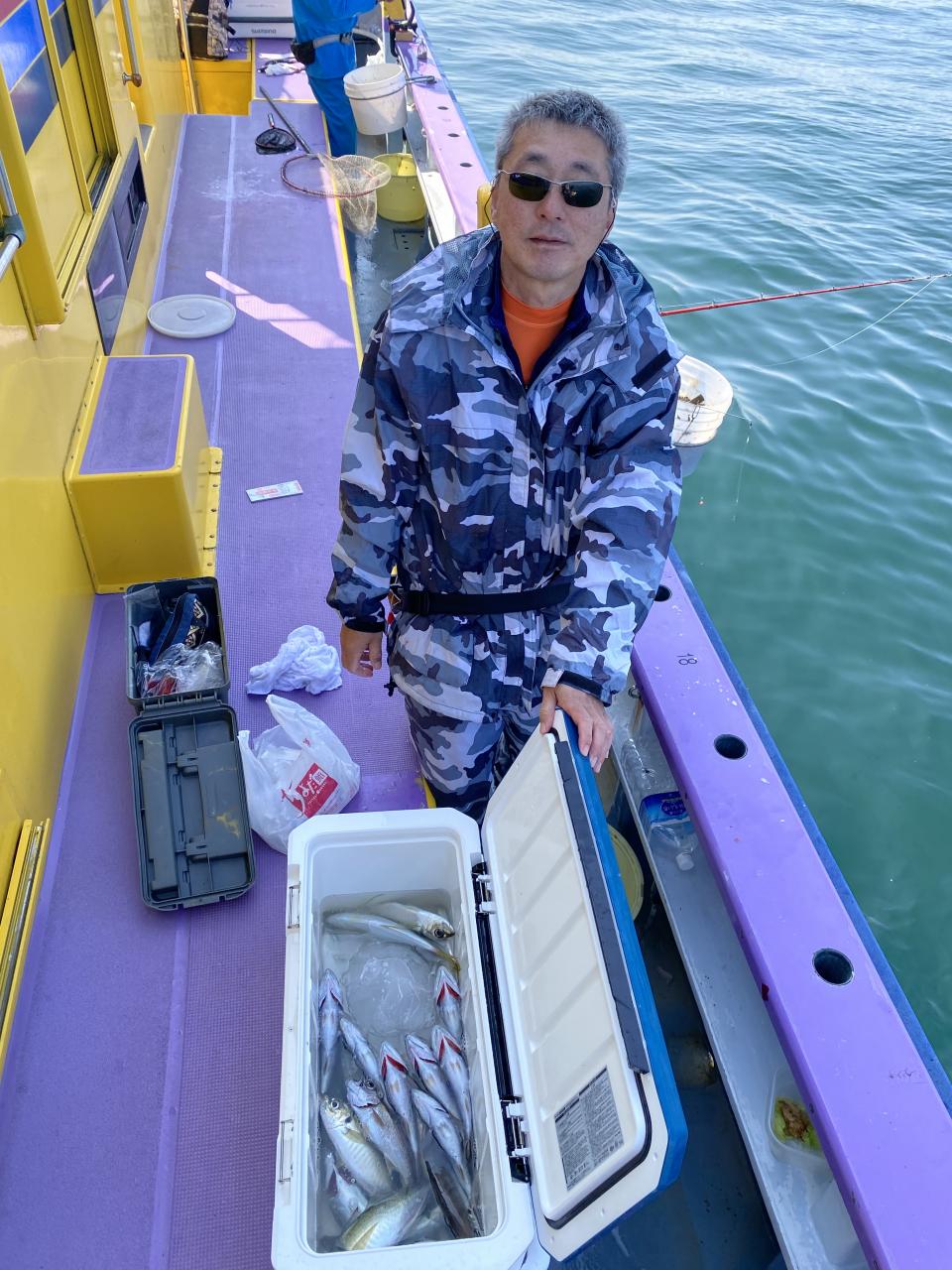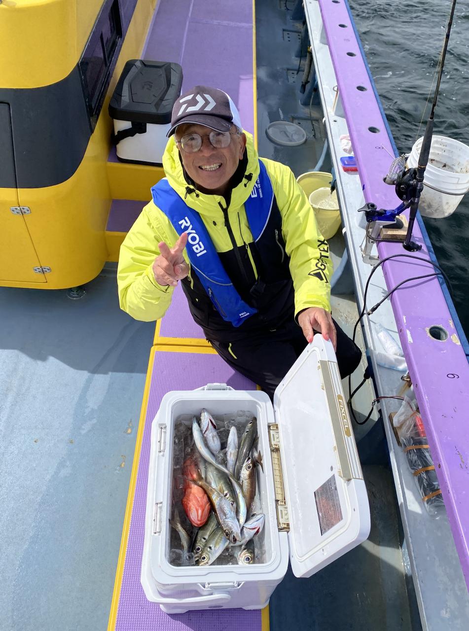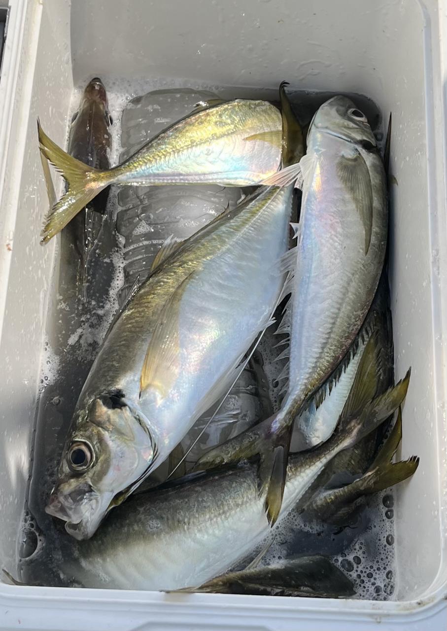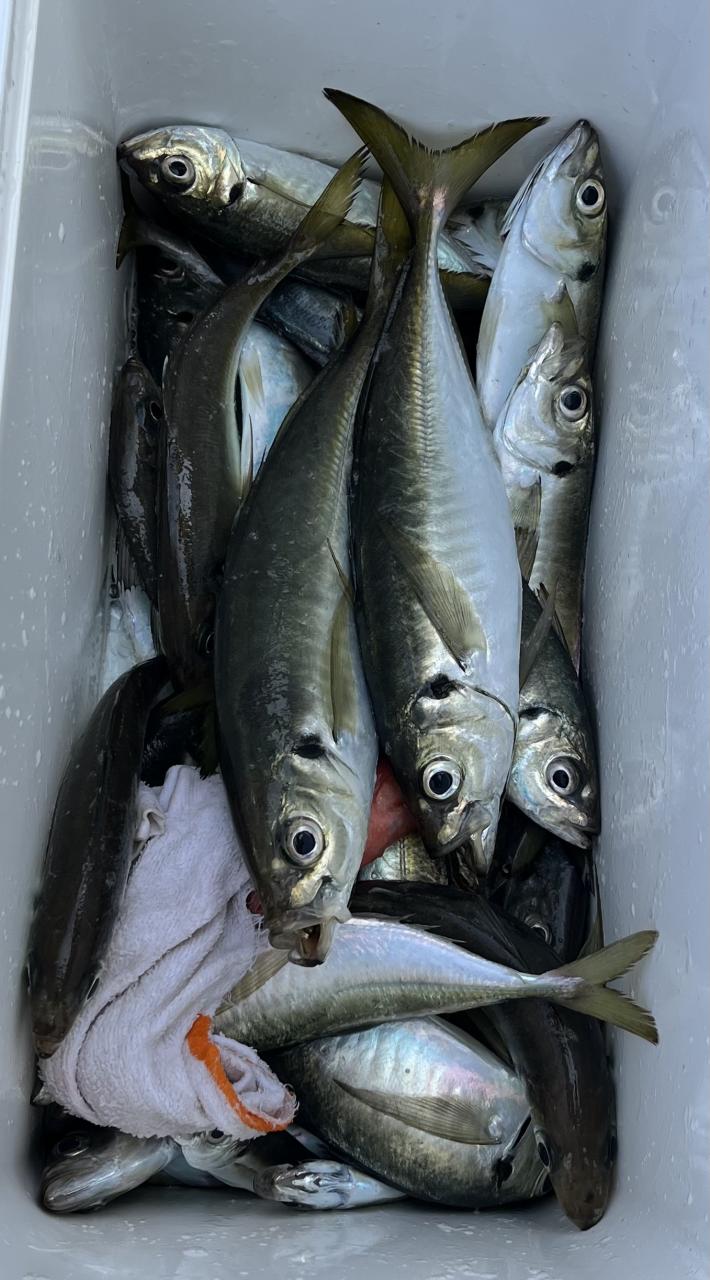 今日は、アジ型を出すと23センチから25センチ28センチクラスの中型メインに30センチオーバーも入り派手さは無いが帰りまで飽きない程度に型を出し、外道にサバとクロムツにマトウダイが!最低の方はリールラインのバックフラッシュトラブルで丁度良い時に釣りを出来なかった方です。お疲れ様でした。