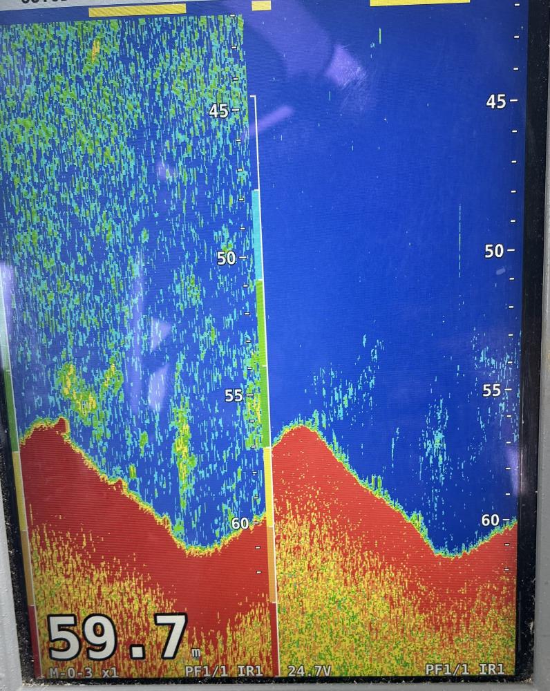 定刻に出船して、昨日朝イチ反応良く型を見たポイントへ行くも・・・昨日と全く違って昨日見た様な反応無く探索からの探索からの実釣するも❌