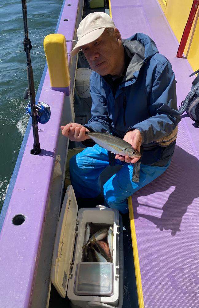 予報通り次第に南の風も強まって来たので、波の静かで潮も速くなく釣りやすい猿島沖ポイントへ大移動してサイズは今イチですが「お孫さん」沖目ポイントでも猿島ポイントでも自力でアジ釣れました✌️