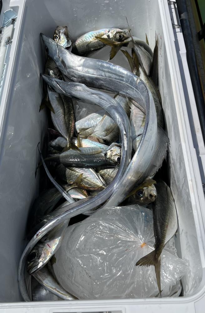 朝イチは広範囲に点々と反応ありアタリあるものの掛け損ないや取り込みでのバラシ多く…。中盤からは沖を中心に見て周り、ラストは港前に戻り、チャンスタイム到来!朝よりもやる気あり、複数人同時ヒットが多かったです!最大129センチ安浦ドラゴン筆頭にドラゴン級、メーター級、良型が主体でした!