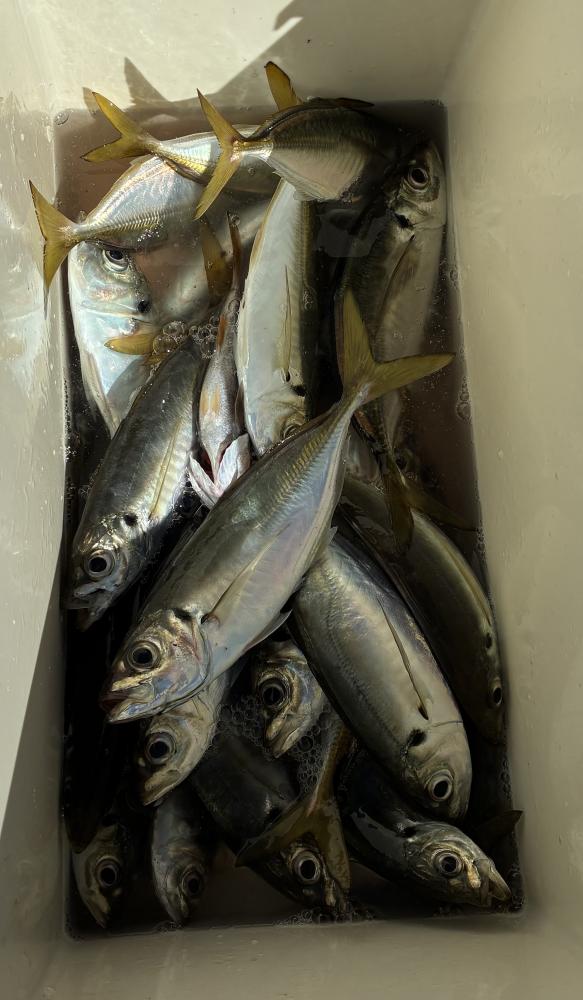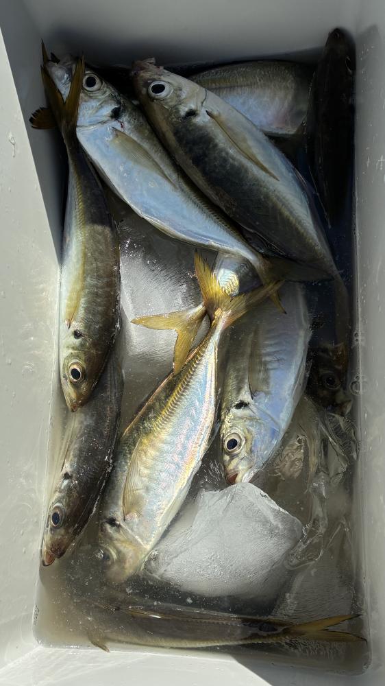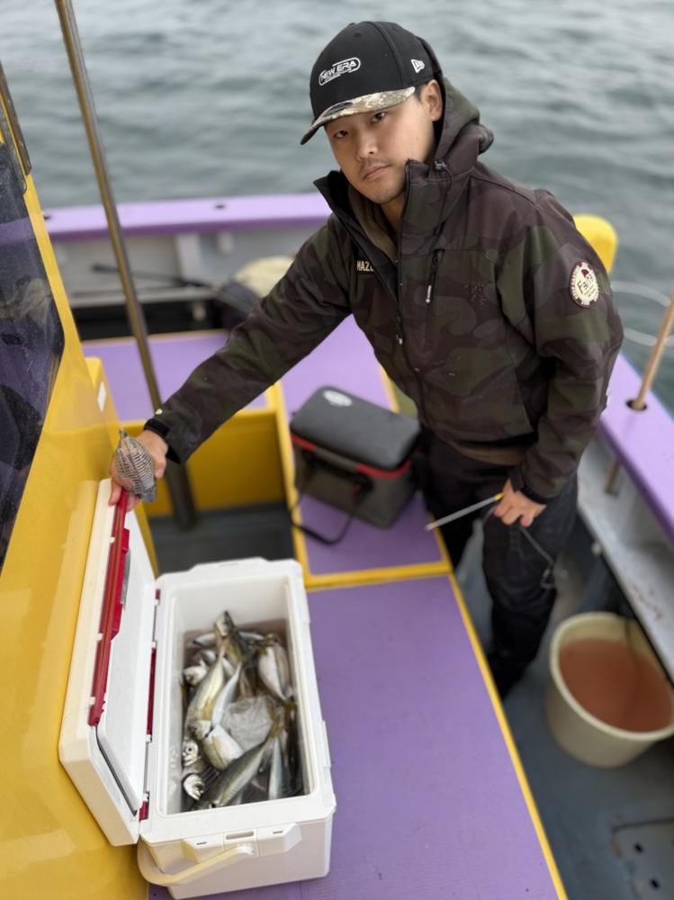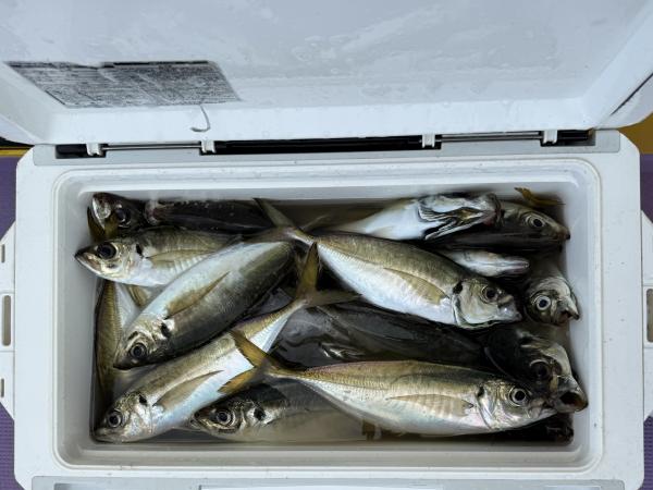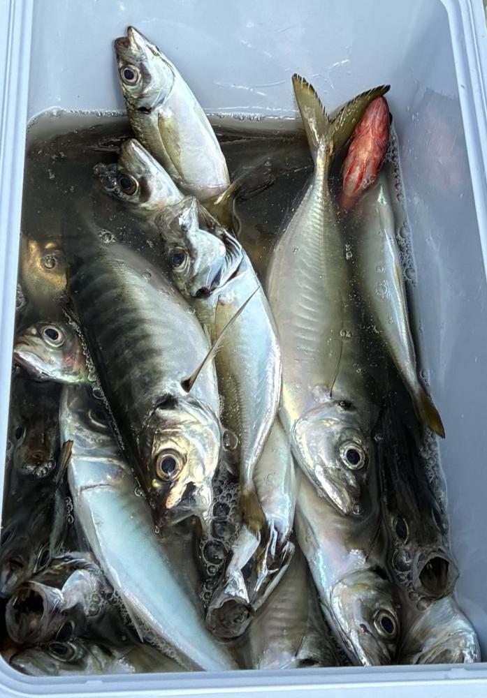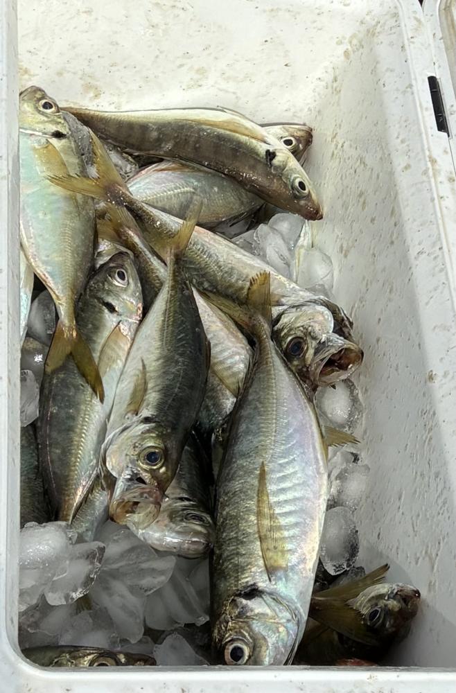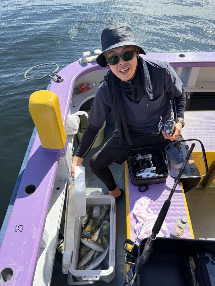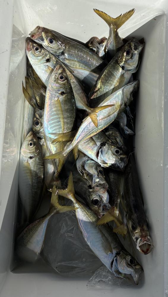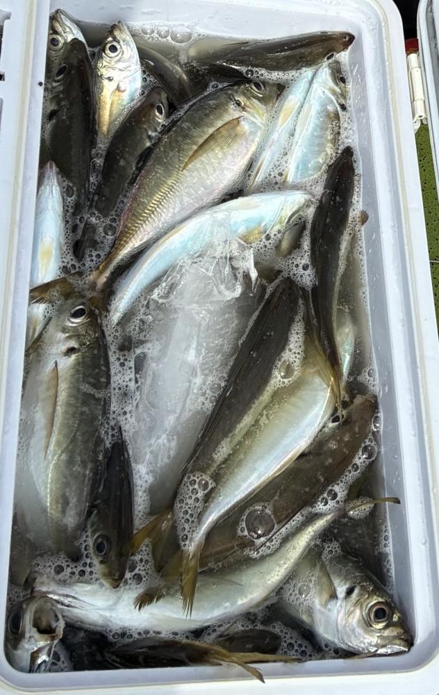 10時45分にタチウオ狙いは終了して、ナギの海上で、レンタルテンヤロッド多数の片付けからレンタルアジロッド多数の支度、ロッドキーパーの取り付けから電源接続、猿島金アジポイントで釣り方レクチャーからの実釣までの取次ぎ時間は1時間20分のアジ釣り開始時間は11時05分となりました、沖上がり時間まで1時間55分とポイント探索時間も限られてある中、実釣開始、反応が入って来ると猿島金アジの顔見られるも❓中々連打❗️連打❗️とはならず、ポイント探索からの探索からの実釣開始するも❓ラスト30分で実釣開始すると活性の高い群れに遭遇して連打❗️連打❗️のシーンもあり、ビシアジデビュー戦の方々にもプチ盛り上がりを体験して頂けました⭕️
