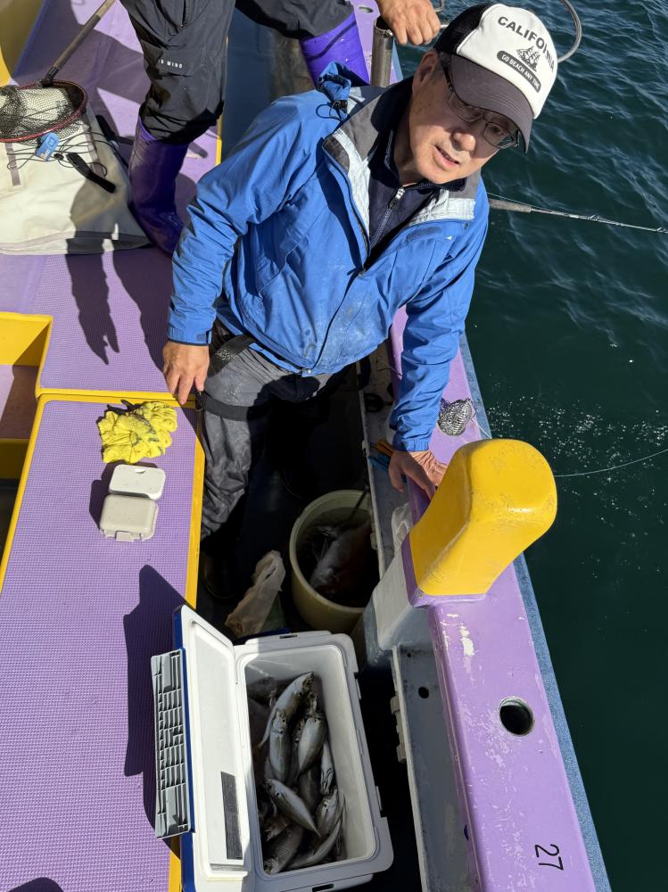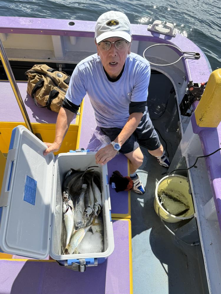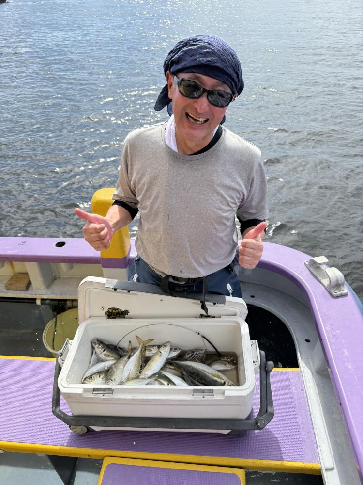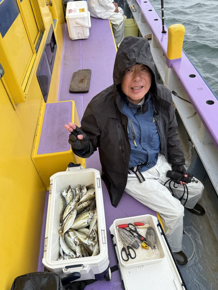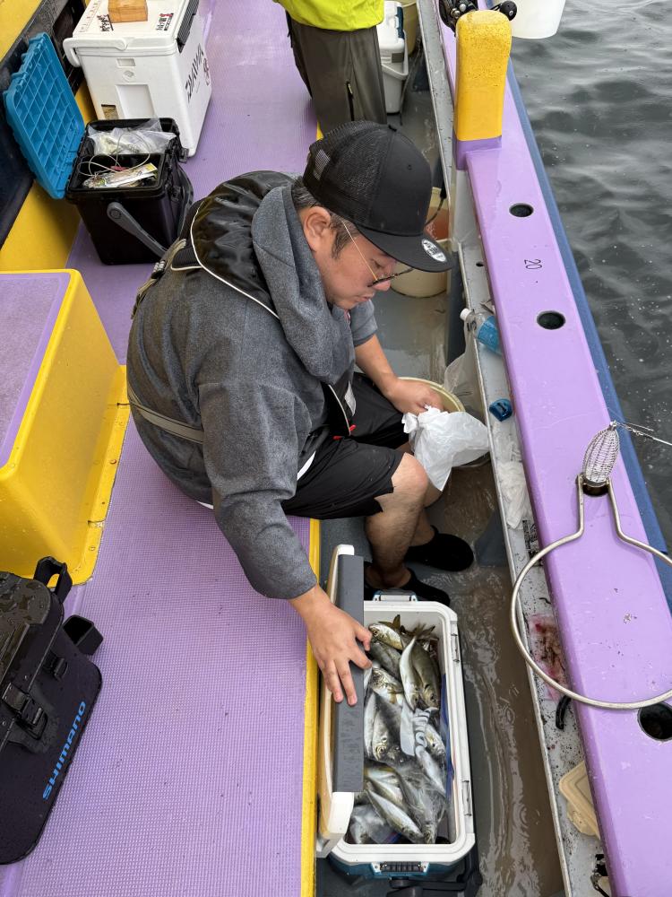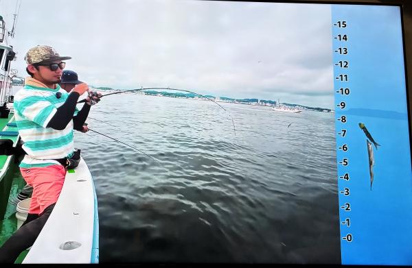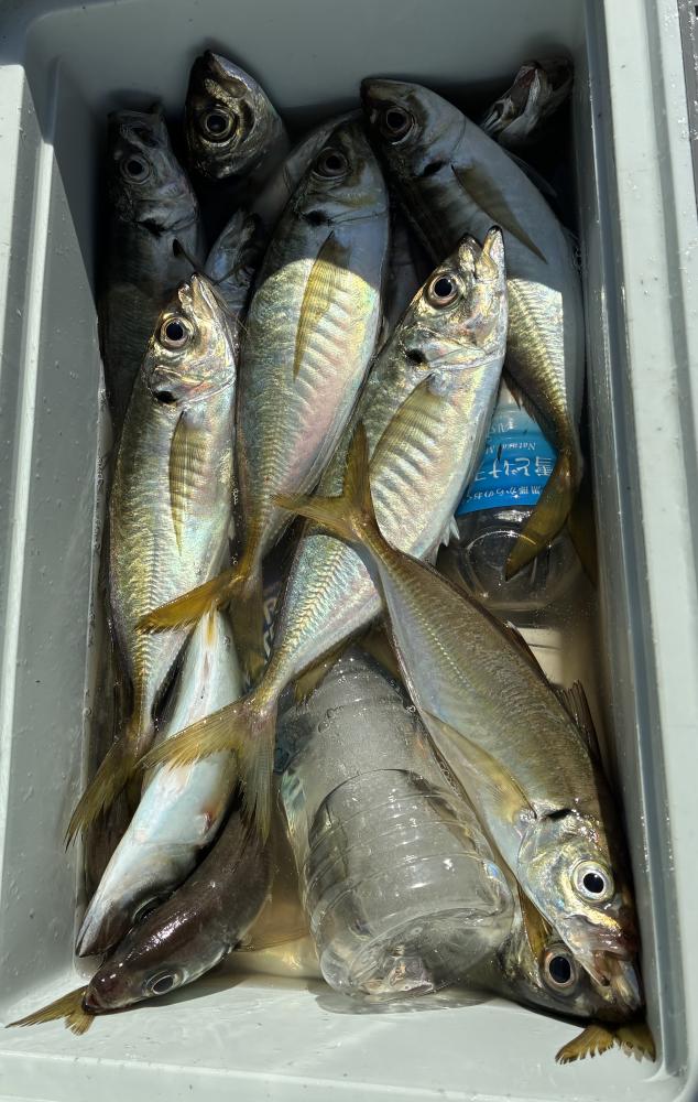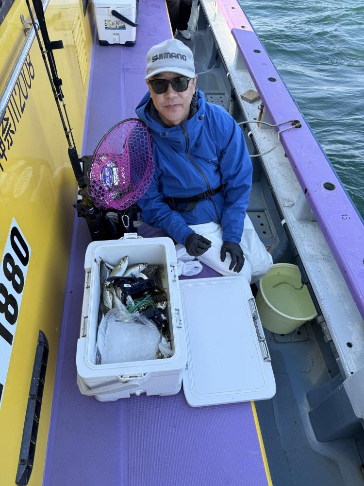 10時45分にタチウオ狙いは終了して、ナギの海上で、レンタルテンヤロッド多数の片付けからレンタルアジロッド多数の支度、ロッドキーパーの取り付けから電源接続、猿島金アジポイントで釣り方レクチャーからの実釣までの取次ぎ時間は1時間20分のアジ釣り開始時間は11時05分となりました、沖上がり時間まで1時間55分とポイント探索時間も限られてある中、実釣開始、反応が入って来ると猿島金アジの顔見られるも❓中々連打❗️連打❗️とはならず、ポイント探索からの探索からの実釣開始するも❓ラスト30分で実釣開始すると活性の高い群れに遭遇して連打❗️連打❗️のシーンもあり、ビシアジデビュー戦の方々にもプチ盛り上がりを体験して頂けました⭕️
