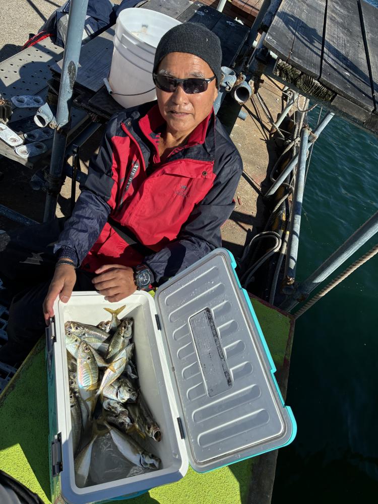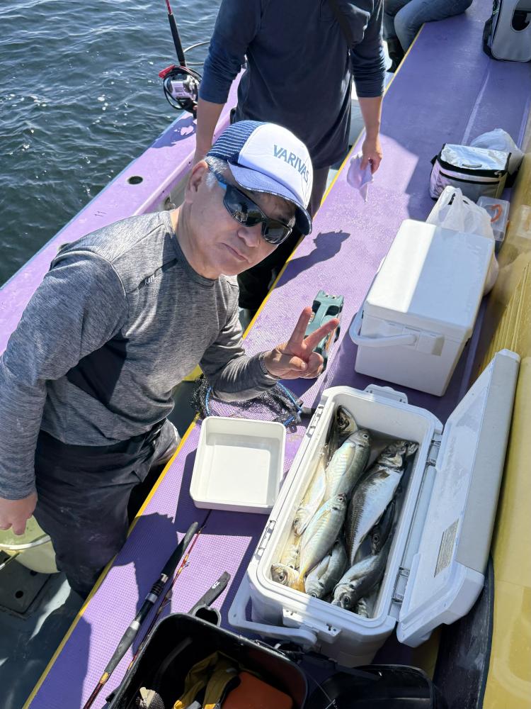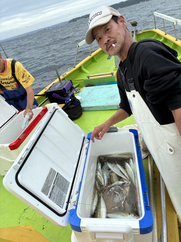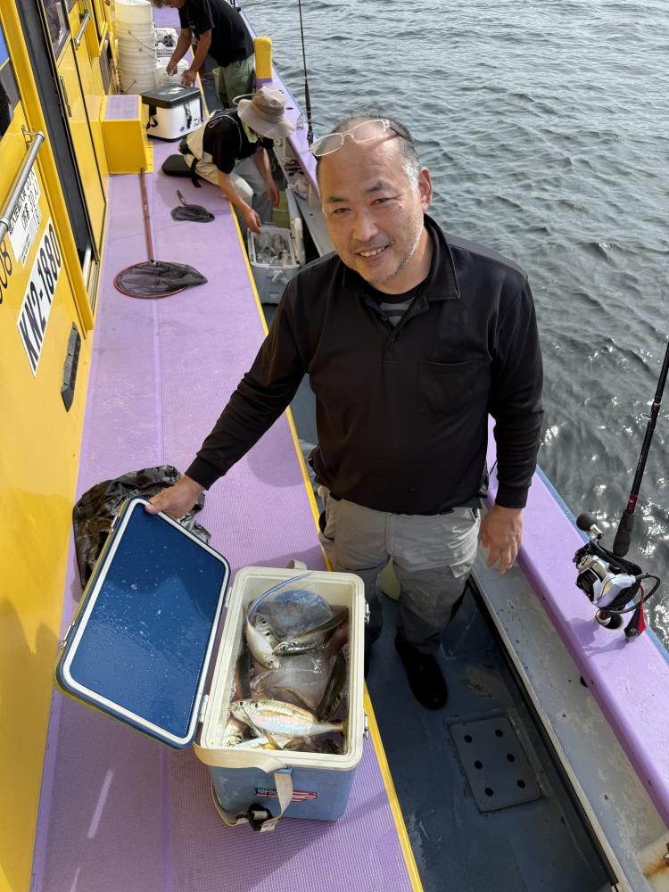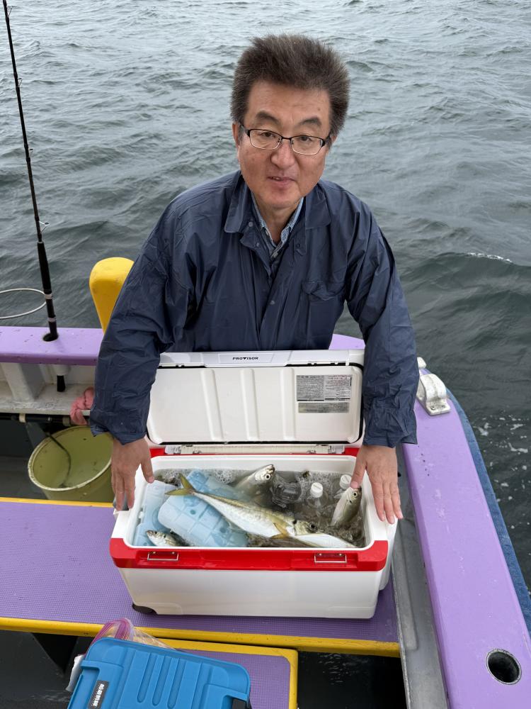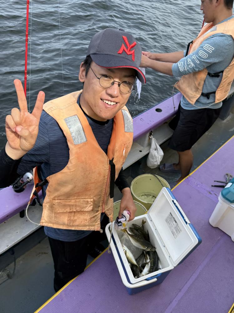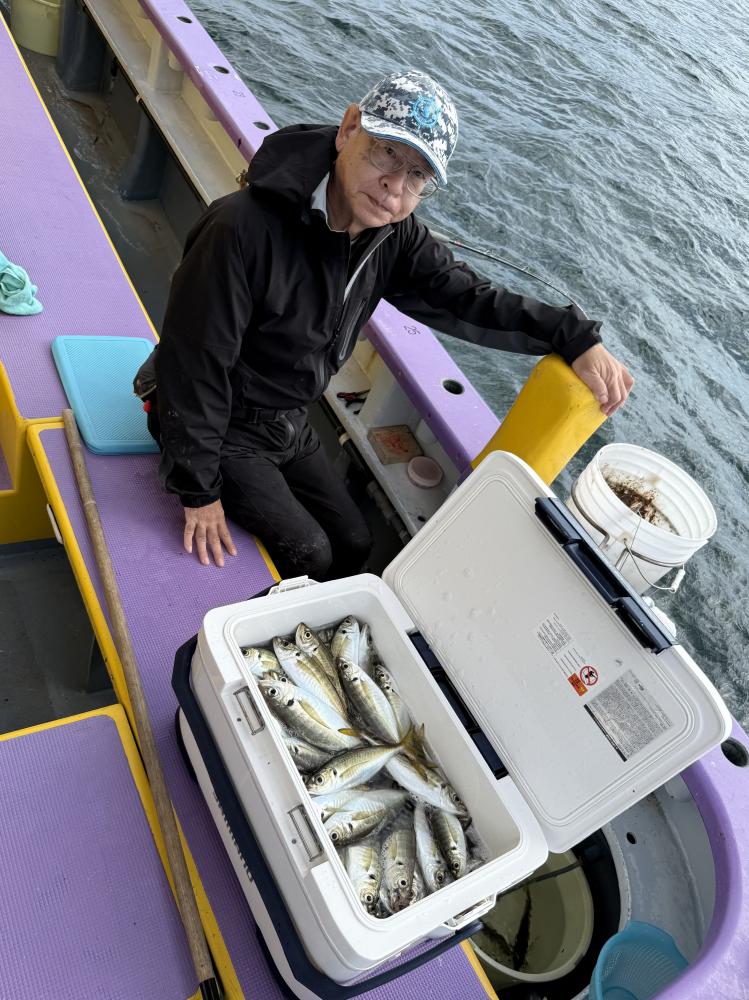 10時45分にタチウオ狙いは終了して、ナギの海上で、レンタルテンヤロッド多数の片付けからレンタルアジロッド多数の支度、ロッドキーパーの取り付けから電源接続、猿島金アジポイントで釣り方レクチャーからの実釣までの取次ぎ時間は1時間20分のアジ釣り開始時間は11時05分となりました、沖上がり時間まで1時間55分とポイント探索時間も限られてある中、実釣開始、反応が入って来ると猿島金アジの顔見られるも❓中々連打❗️連打❗️とはならず、ポイント探索からの探索からの実釣開始するも❓ラスト30分で実釣開始すると活性の高い群れに遭遇して連打❗️連打❗️のシーンもあり、ビシアジデビュー戦の方々にもプチ盛り上がりを体験して頂けました⭕️