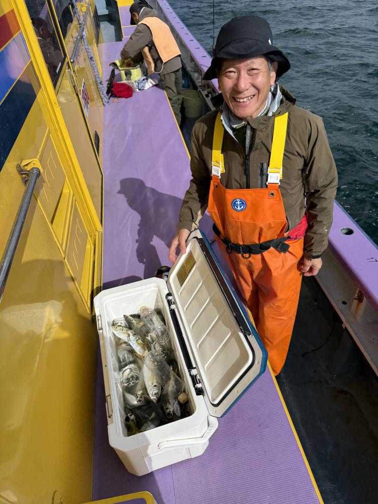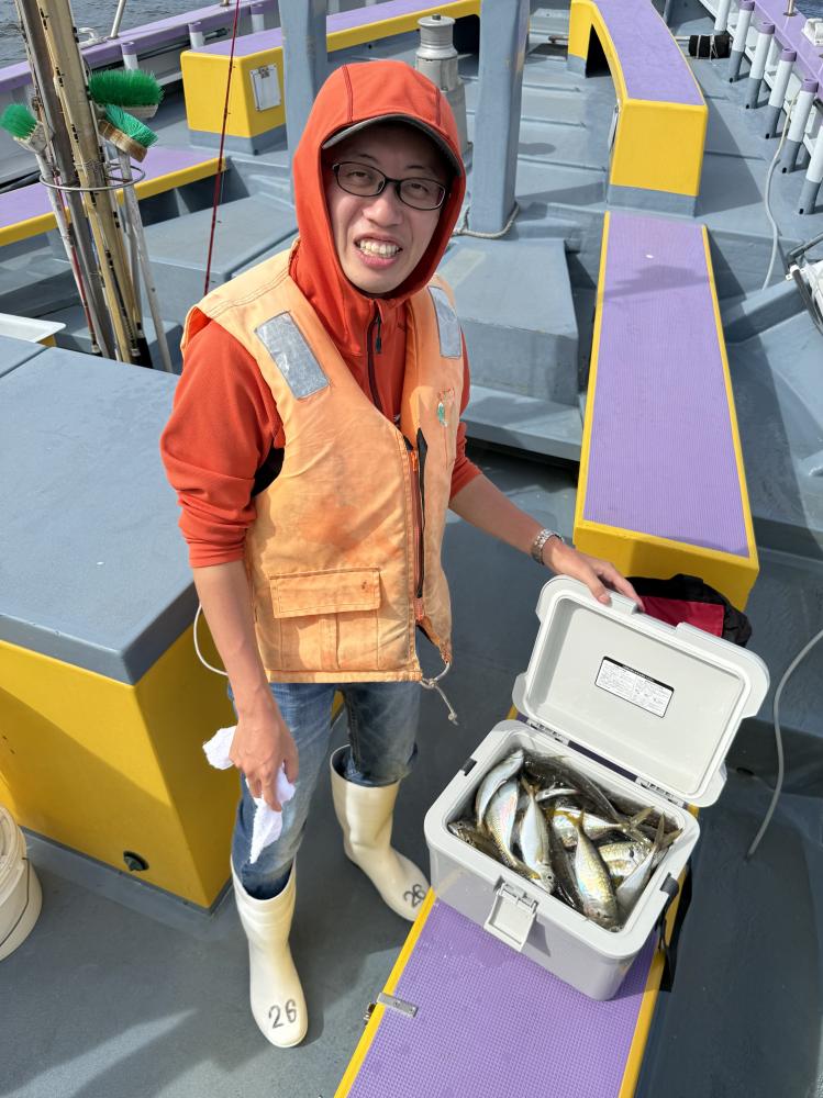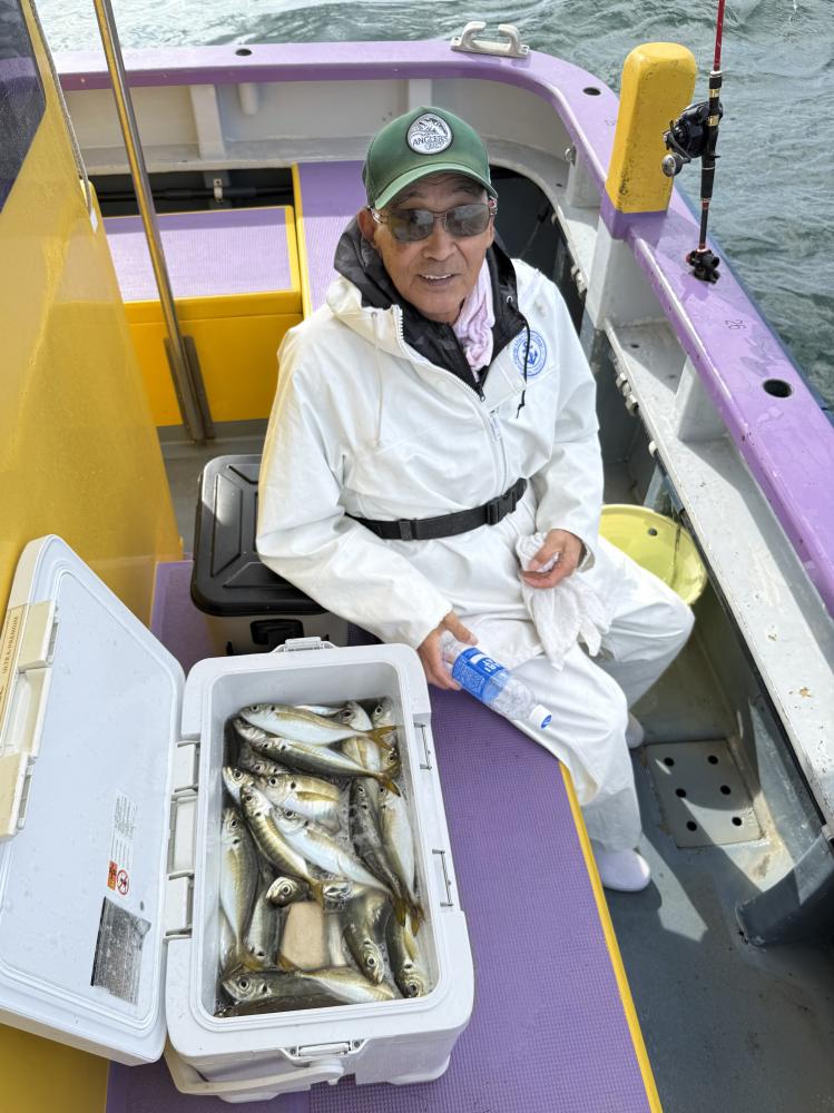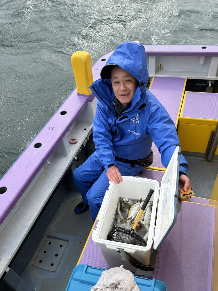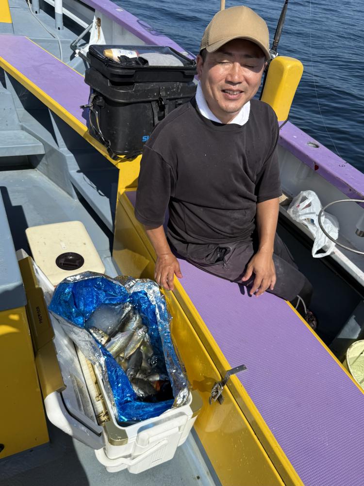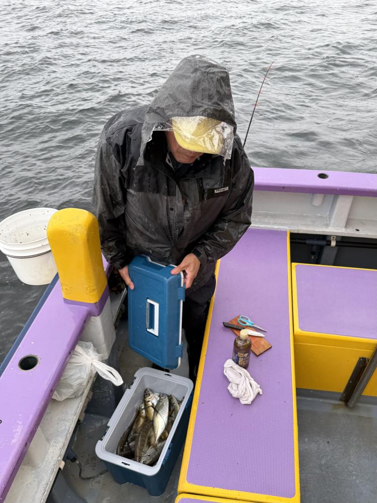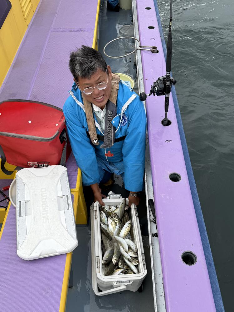 10時45分にタチウオ狙いは終了して、ナギの海上で、レンタルテンヤロッド多数の片付けからレンタルアジロッド多数の支度、ロッドキーパーの取り付けから電源接続、猿島金アジポイントで釣り方レクチャーからの実釣までの取次ぎ時間は1時間20分のアジ釣り開始時間は11時05分となりました、沖上がり時間まで1時間55分とポイント探索時間も限られてある中、実釣開始、反応が入って来ると猿島金アジの顔見られるも❓中々連打❗️連打❗️とはならず、ポイント探索からの探索からの実釣開始するも❓ラスト30分で実釣開始すると活性の高い群れに遭遇して連打❗️連打❗️のシーンもあり、ビシアジデビュー戦の方々にもプチ盛り上がりを体験して頂けました⭕️