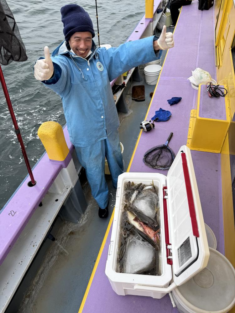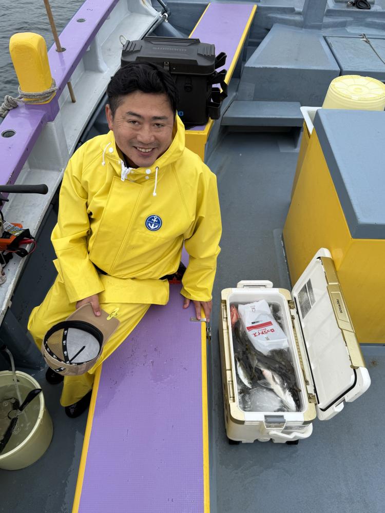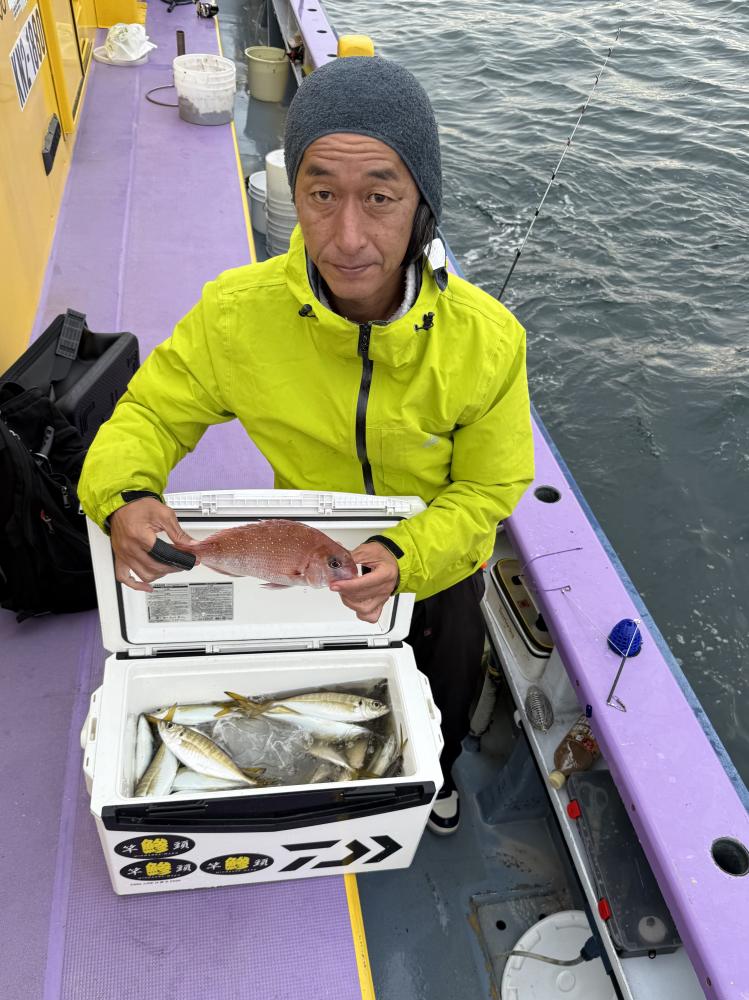 今日は、朝から雨模様、寂しくアジ釣り人3名様で出船。アジ型を出すと20センチ前後の型から23センチ25センチクラスがメインに時折り30センチクラスも交じりで帰りまで楽しめました。外道に1kのクロダイが!