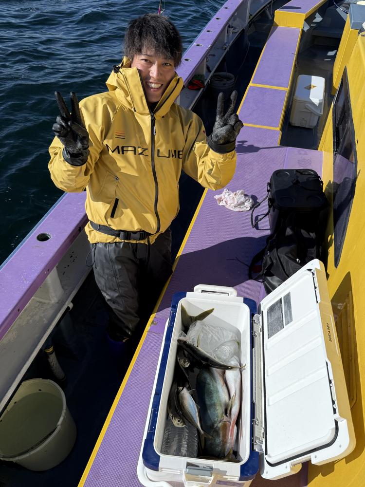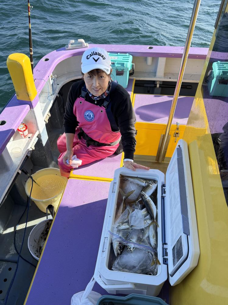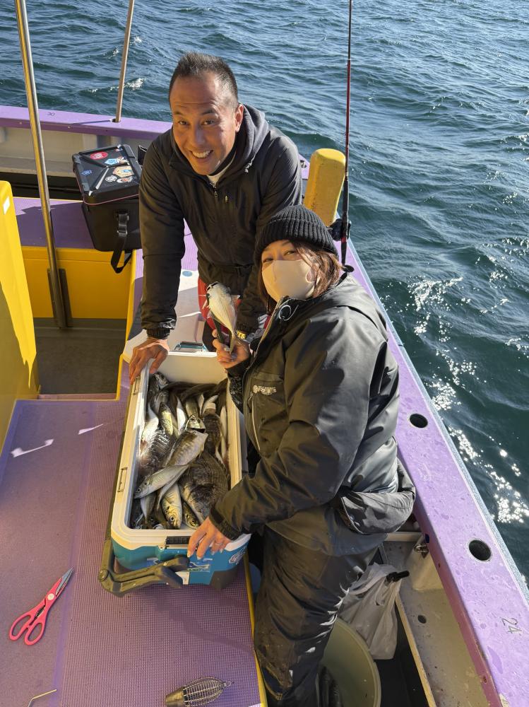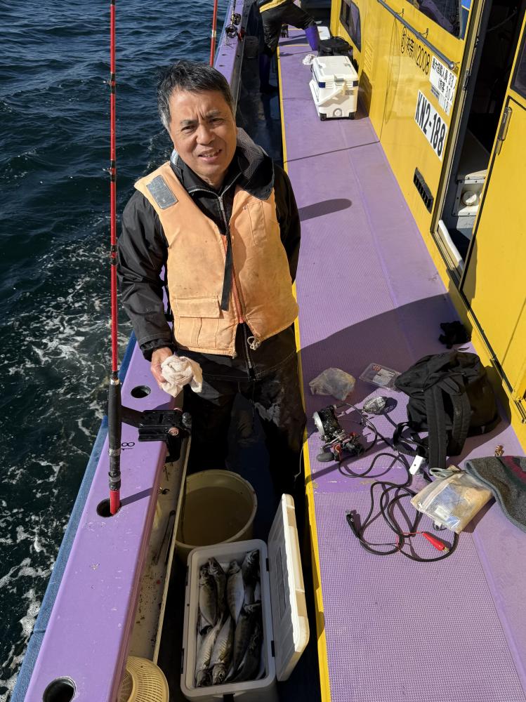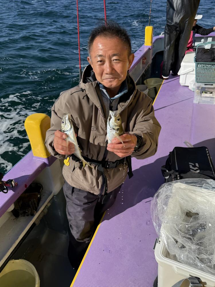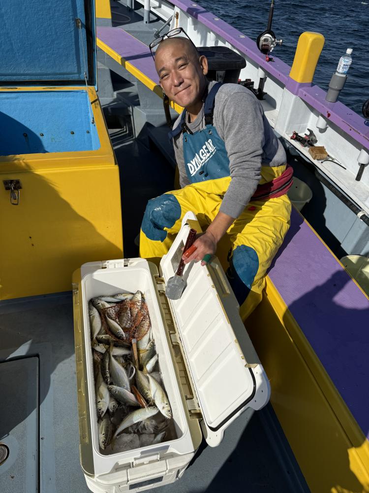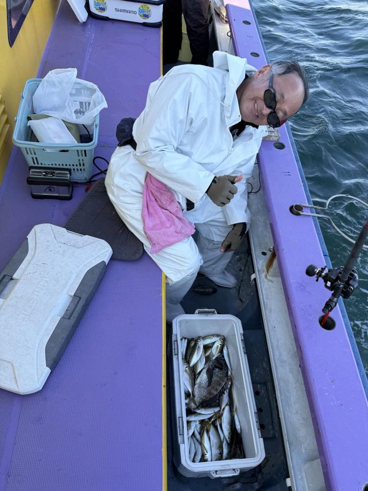 今日は、アジ型を出すと18センチから20センチ23センチクラスがメインにダブル交じりで食い有り、レンタルロッドの方ですが手慣れた流れで府川氏ダントツ140尾と釣りまくる!外道に500から1.5kのマダイと1k前後のクロダイが船中3枚交じる!
