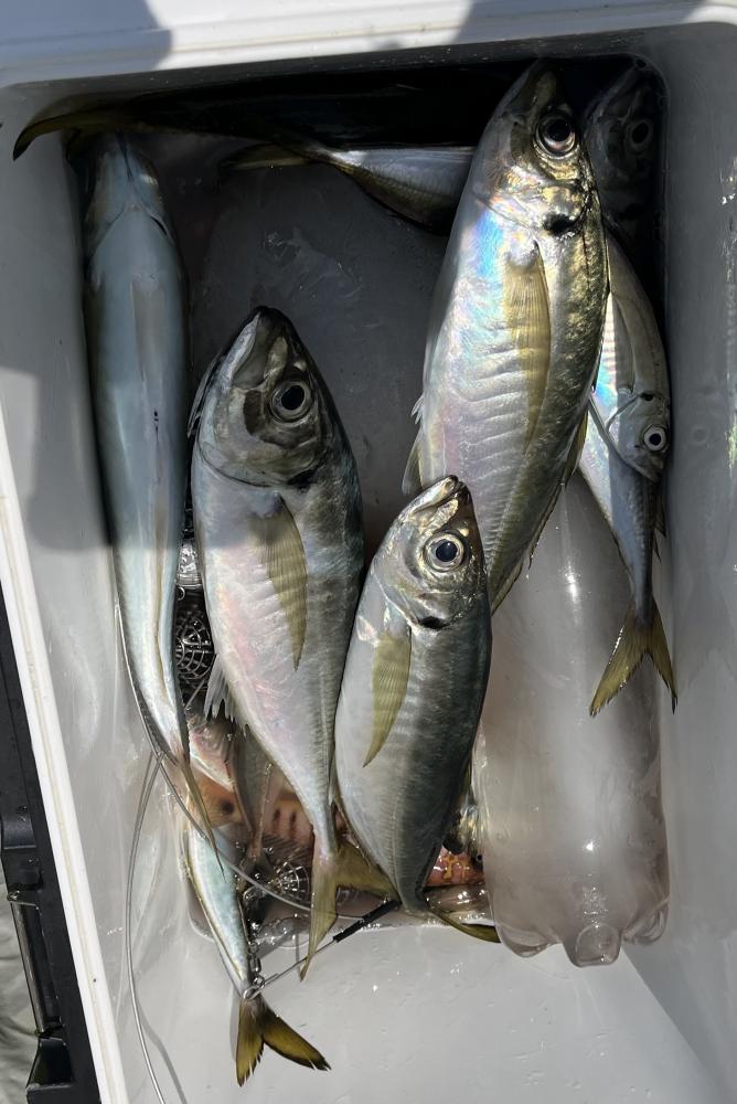 朝イチは沖目ポイントへ行き、激流の下げ潮の中での実釣開始、良型アジメインにトリプルヒットもありましたが、時合いが過ぎると反応がパタっと出なくなりました❌